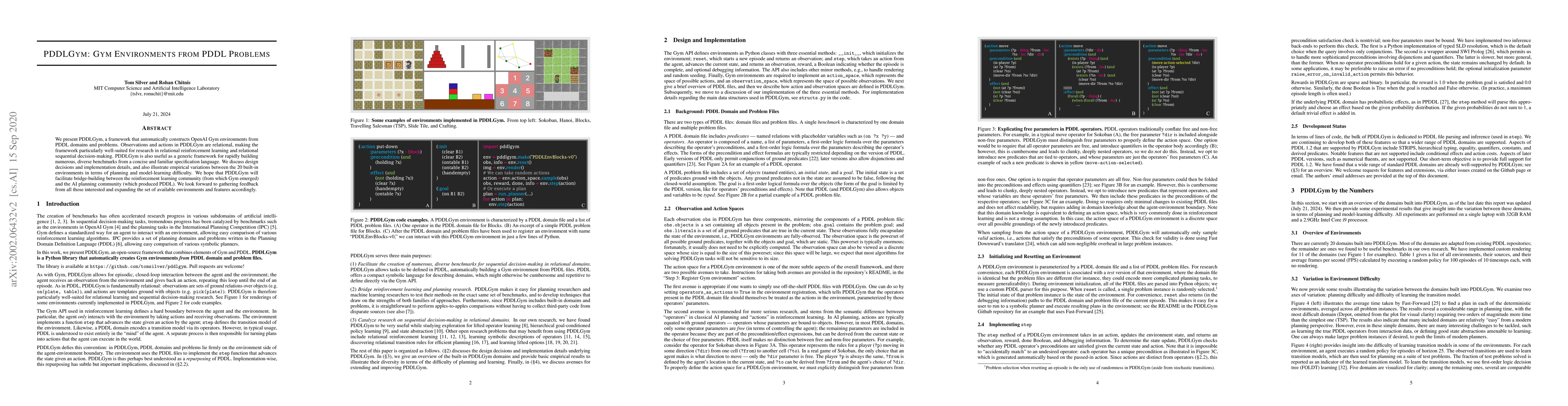 PDDLGym is a framework that converts PDDL domains and problems into OpenAI Gym environments, facilitating research in relational reinforcement learning. It aims to bridge the reinforcement learning and AI planning communities by providing diverse benchmarks from a concise specification language.