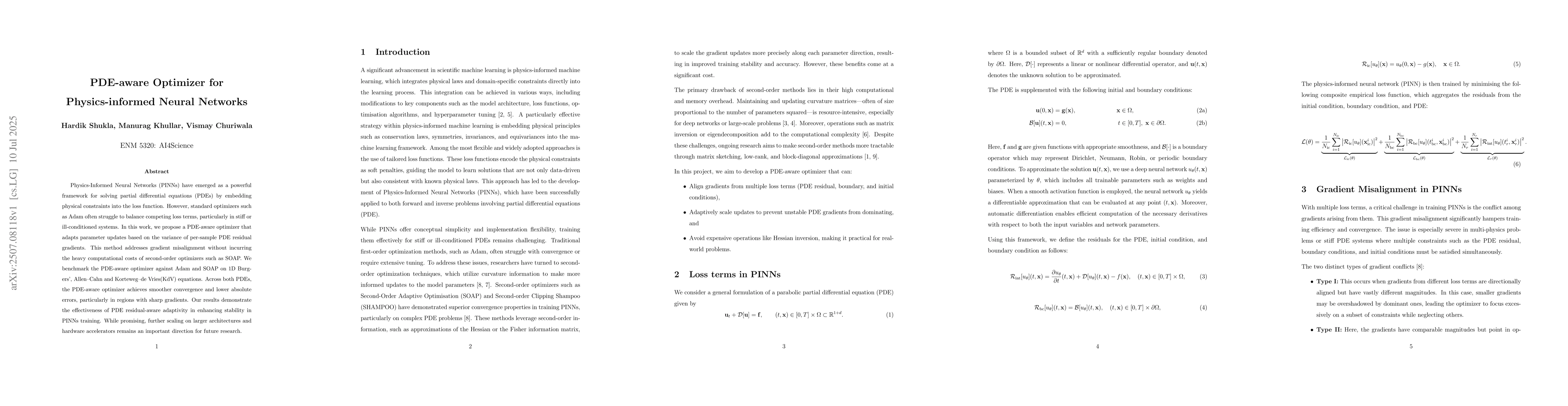 The research proposes a PDE-aware optimizer for Physics-Informed Neural Networks (PINNs) that adapts parameter updates based on the variance of per-sample PDE residual gradients, addressing gradient misalignment issues without heavy computational costs.