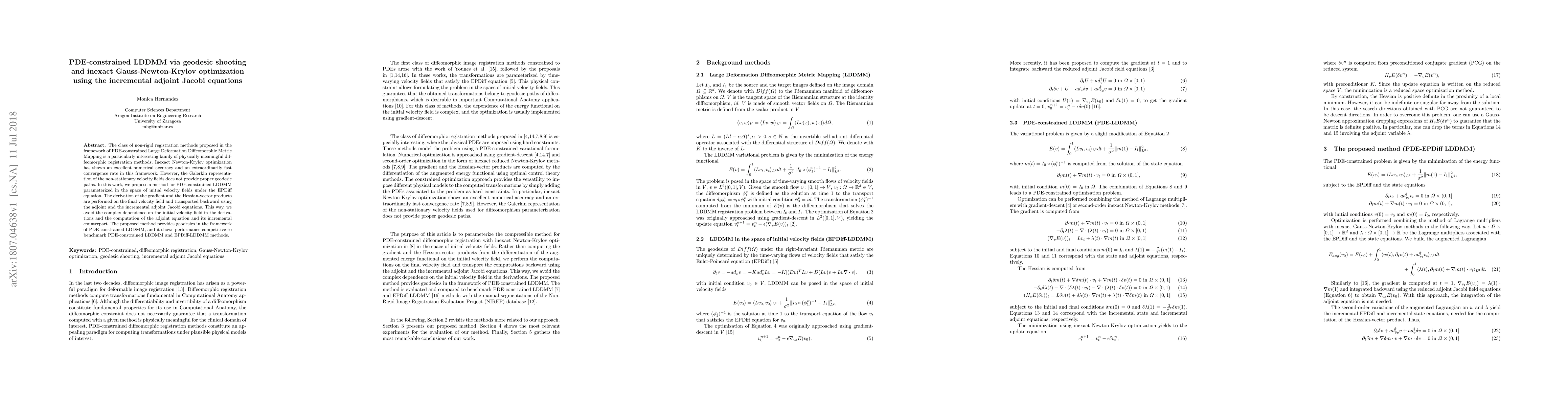 This paper presents a novel method for PDE-constrained Large Deformation Diffeomorphic Metric Mapping (LDDMM) using geodesic shooting and inexact Gauss-Newton-Krylov optimization. The method derives gradients and Hessian-vector products on the final velocity field, transported backward using adjoint equations, to achieve competitive performance while avoiding complex initial velocity field dependencies.