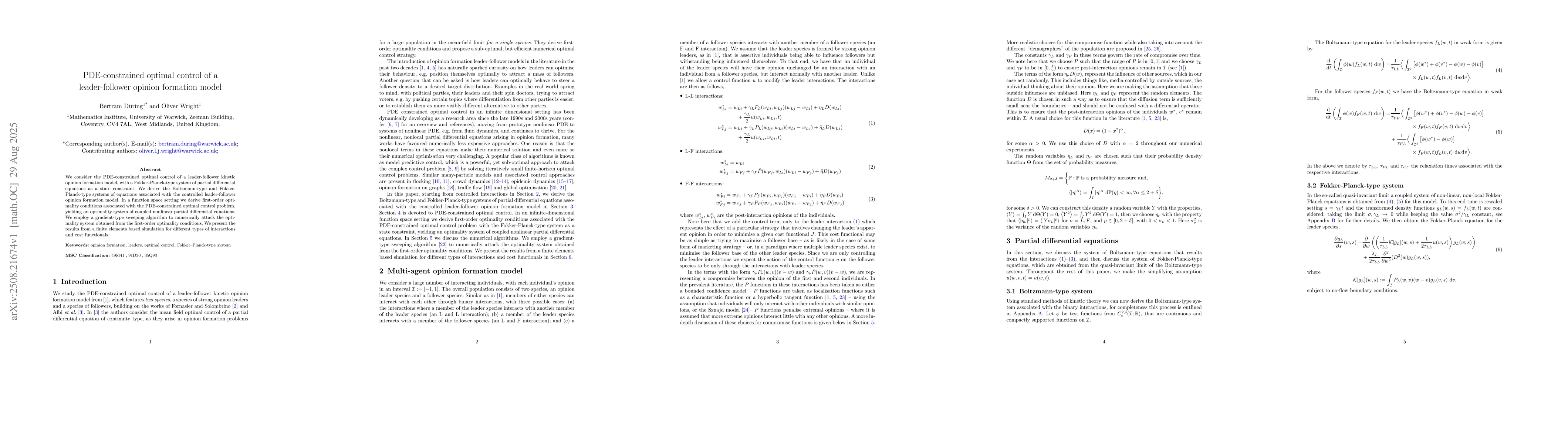 We consider the PDE-constrained optimal control of a leader-follower kinetic opinion formation model, with a Fokker-Planck-type system of partial differential equations as a state constraint. We derive the Boltzmann-type and Fokker-Planck-type systems of equations associated with the controlled leader-follower opinion formation model. In a function space setting we derive first-order optimality conditions associated with the PDE-constrained optimal control problem, yielding an optimality system of coupled nonlinear partial differential equations. We employ a gradient-type sweeping algorithm to numerically attack the optimality system obtained from the first-order optimality conditions. We present the results from a finite elements based simulation for different types of interactions and cost functionals.