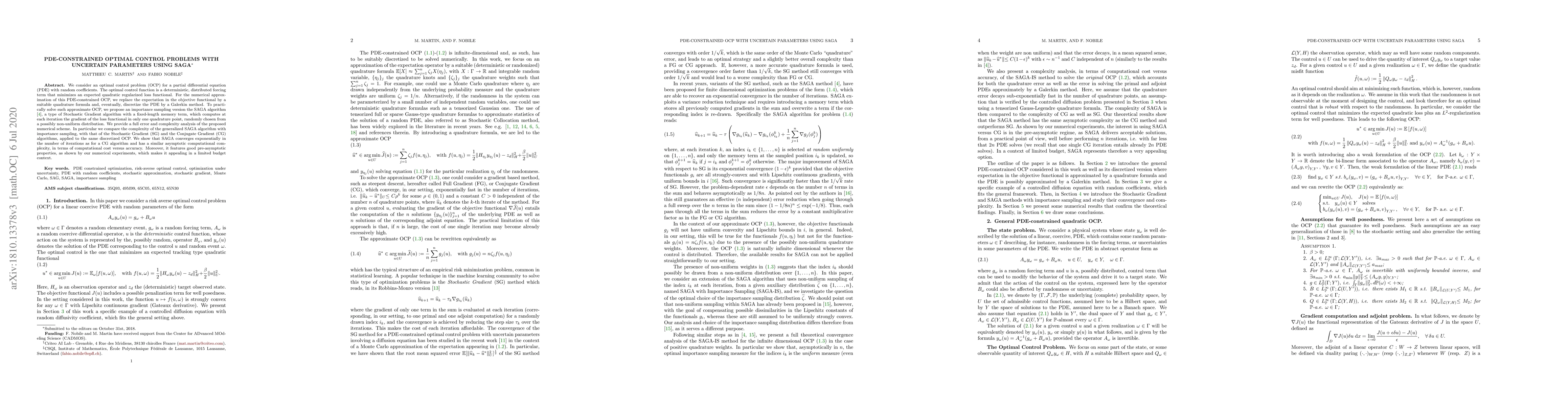 This paper addresses optimal control problems for PDEs with uncertain parameters, proposing a SAGA algorithm with importance sampling for numerical approximation. The study compares the efficiency and convergence of SAGA with Stochastic Gradient and Conjugate Gradient methods, demonstrating SAGA's exponential convergence and similar computational complexity, while highlighting its practical advantages in limited budget scenarios.