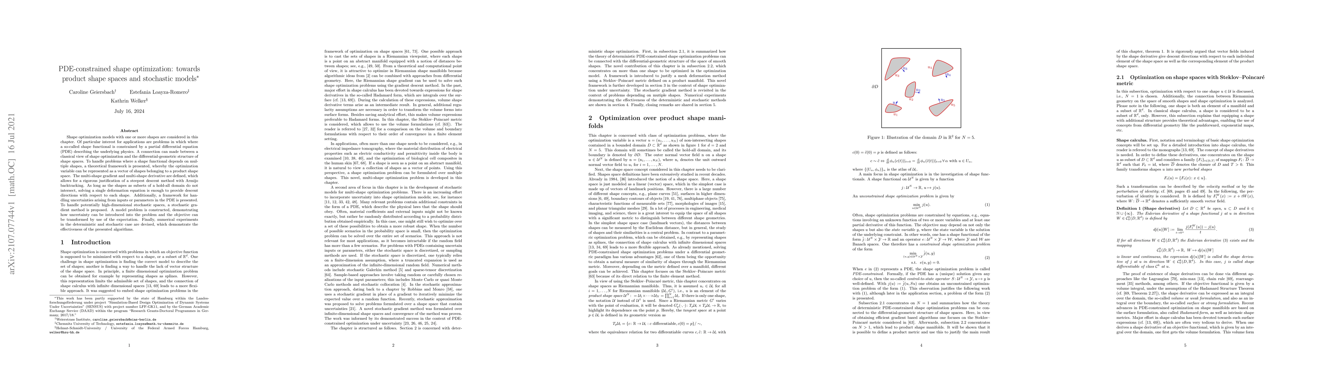 Shape optimization models with one or more shapes are considered in this chapter. Of particular interest for applications are problems in which where a so-called shape functional is constrained by a partial differential equation (PDE) describing the underlying physics. A connection can made between a classical view of shape optimization and the differential-geometric structure of shape spaces. To handle problems where a shape functional depends on multiple shapes, a theoretical framework is presented, whereby the optimization variable can be represented as a vector of shapes belonging to a product shape space. The multi-shape gradient and multi-shape derivative are defined, which allows for a rigorous justification of a steepest descent method with Armijo backtracking. As long as the shapes as subsets of a hold-all domain do not intersect, solving a single deformation equation is enough to provide descent directions with respect to each shape. Additionally, a framework for handling uncertainties arising from inputs or parameters in the PDE is presented. To handle potentially high-dimensional stochastic spaces, a stochastic gradient method is proposed. A model problem is constructed, demonstrating how uncertainty can be introduced into the problem and the objective can be transformed by use of the expectation. Finally, numerical experiments in the deterministic and stochastic case are devised, which demonstrate the effectiveness of the presented algorithms.