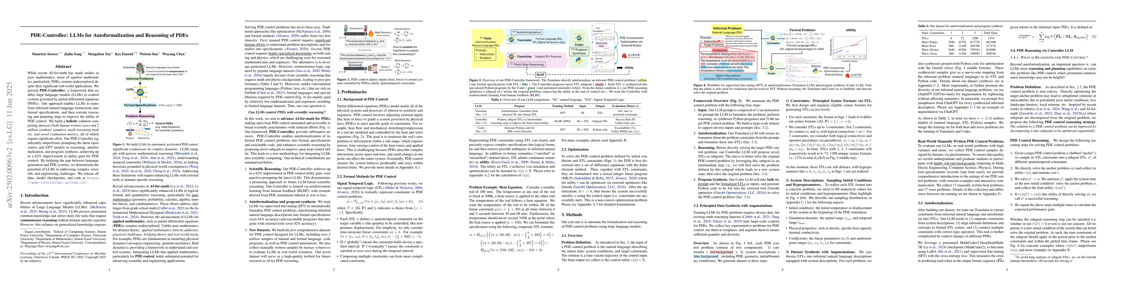 While recent AI-for-math has made strides in pure mathematics, areas of applied mathematics, particularly PDEs, remain underexplored despite their significant real-world applications. We present PDE-Controller, a framework that enables large language models (LLMs) to control systems governed by partial differential equations (PDEs). Our approach enables LLMs to transform informal natural language instructions into formal specifications, and then execute reasoning and planning steps to improve the utility of PDE control. We build a holistic solution comprising datasets (both human-written cases and 2 million synthetic samples), math-reasoning models, and novel evaluation metrics, all of which require significant effort. Our PDE-Controller significantly outperforms prompting the latest open source and GPT models in reasoning, autoformalization, and program synthesis, achieving up to a 62% improvement in utility gain for PDE control. By bridging the gap between language generation and PDE systems, we demonstrate the potential of LLMs in addressing complex scientific and engineering challenges. We release all data, model checkpoints, and code at https://pde-controller.github.io/.