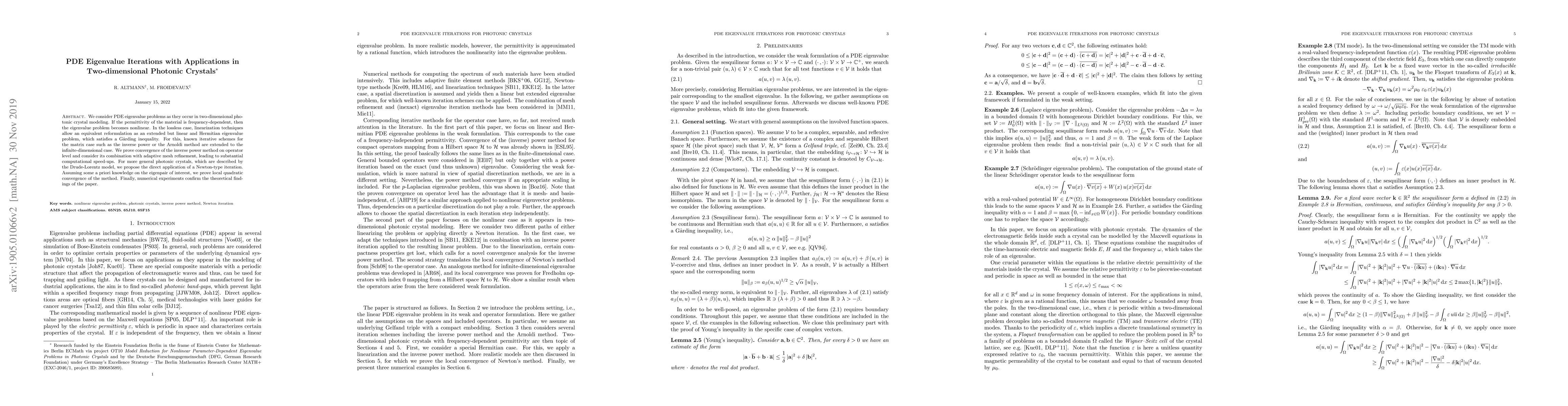 We consider PDE eigenvalue problems as they occur in two-dimensional photonic crystal modeling. If the permittivity of the material is frequency-dependent, then the eigenvalue problem becomes nonlinear. In the lossless case, linearization techniques allow an equivalent reformulation as an extended but linear and Hermitian eigenvalue problem, which satisfies a Garding inequality. For this, known iterative schemes for the matrix case such as the inverse power or the Arnoldi method are extended to the infinite-dimensional case. We prove convergence of the inverse power method on operator level and consider its combination with adaptive mesh refinement, leading to substantial computational speed-ups. For more general photonic crystals, which are described by the Drude-Lorentz model, we propose the direct application of a Newton-type iteration. Assuming some a priori knowledge on the eigenpair of interest, we prove local quadratic convergence of the method. Finally, numerical experiments confirm the theoretical findings of the paper.