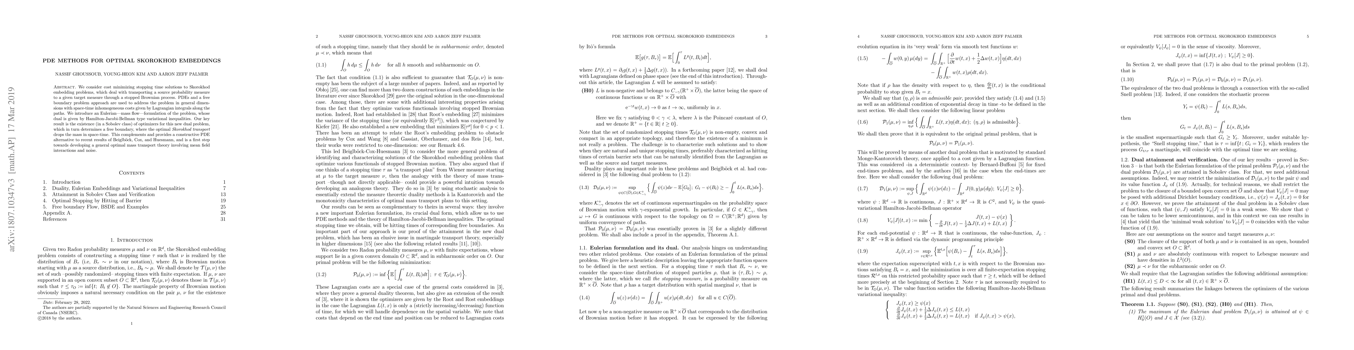 We consider cost minimizing stopping time solutions to Skorokhod embedding problems, which deal with transporting a source probability measure to a given target measure through a stopped Brownian process. PDEs and a free boundary problem approach are used to address the problem in general dimensions with space-time inhomogeneous costs given by Lagrangian integrals along the paths. We introduce an Eulerian---mass flow---formulation of the problem, whose dual is given by Hamilton-Jacobi-Bellman type variational inequalities. Our key result is the existence (in a Sobolev class) of optimizers for this new dual problem, which in turn determines a free boundary, where the optimal Skorokhod transport drops the mass in space-time. This complements and provides a constructive PDE alternative to recent results of Beiglb\"ock, Cox, and Huesmann, and is a first step towards developing a general optimal mass transport theory involving mean field interactions and noise.