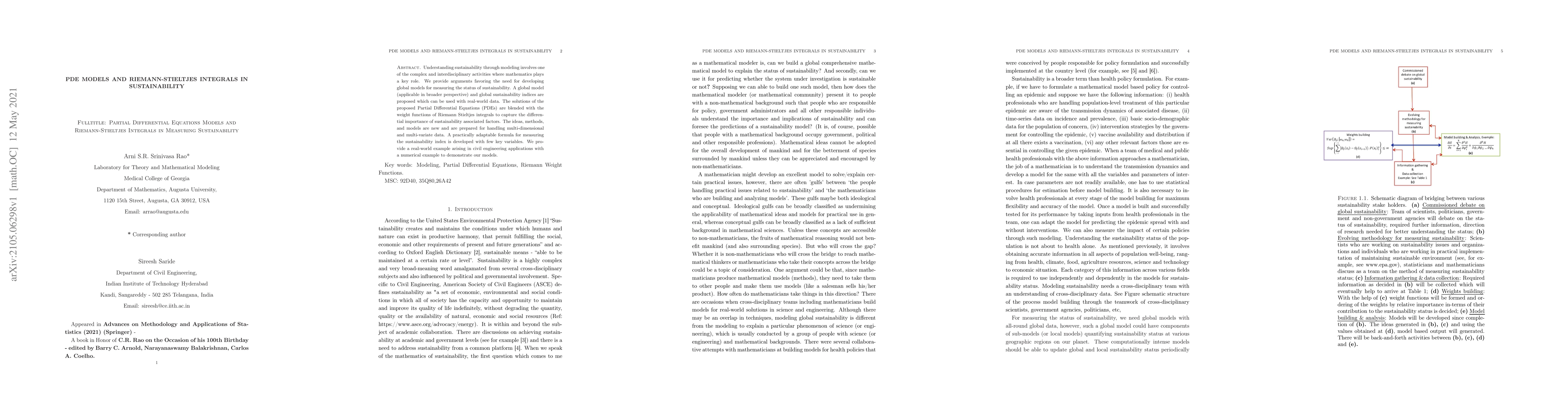 Understanding sustainability through modeling involves one of the complex and interdisciplinary activities where mathematics plays a key role. We provide arguments favoring the need for developing global models for measuring the status of sustainability. A global model (applicable in broader perspective) and global sustainability indices are proposed which can be used with real-world data. The solutions of the proposed Partial Differential Equations (PDEs) are blended with the weight functions of Riemann Stieltjes integrals to capture the differential importance of sustainability associated factors. The ideas, methods, and models are new and are prepared for handling multi-dimensional and multi-variate data. A practically adaptable formula for measuring the sustainability index is developed with few key variables. We provide a real-world example arising in civil engineering applications with a numerical example to demonstrate our models.