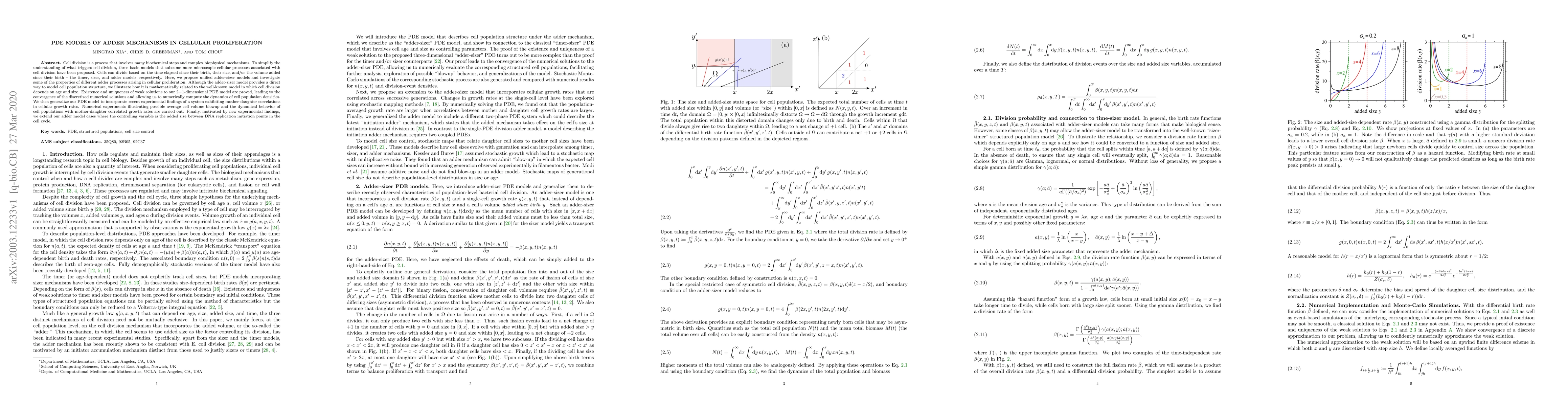 Cell division is a process that involves many biochemical steps and complex biophysical mechanisms. To simplify the understanding of what triggers cell division, three basic models that subsume more microscopic cellular processes associated with cell division have been proposed. Cells can divide based on the time elapsed since their birth, their size, and/or the volume added since their birth -- the timer, sizer, and adder models, respectively. Here, we propose unified adder-sizer models and investigate some of the properties of different adder processes arising in cellular proliferation. Although the adder-sizer model provides a direct way to model cell population structure, we illustrate how it is mathematically related to the well-known model in which cell division depends on age and size. Existence and uniqueness of weak solutions to our 2+1-dimensional PDE model are proved, leading to the convergence of the discretized numerical solutions and allowing us to numerically compute the dynamics of cell population densities. We then generalize our PDE model to incorporate recent experimental findings of a system exhibiting mother-daughter correlations in cellular growth rates. Numerical experiments illustrating possible average cell volume blowup and the dynamical behavior of cell populations with mother-daughter correlated growth rates are carried out. Finally, motivated by new experimental findings, we extend our adder model cases where the controlling variable is the added size between DNA replication initiation points in the cell cycle.