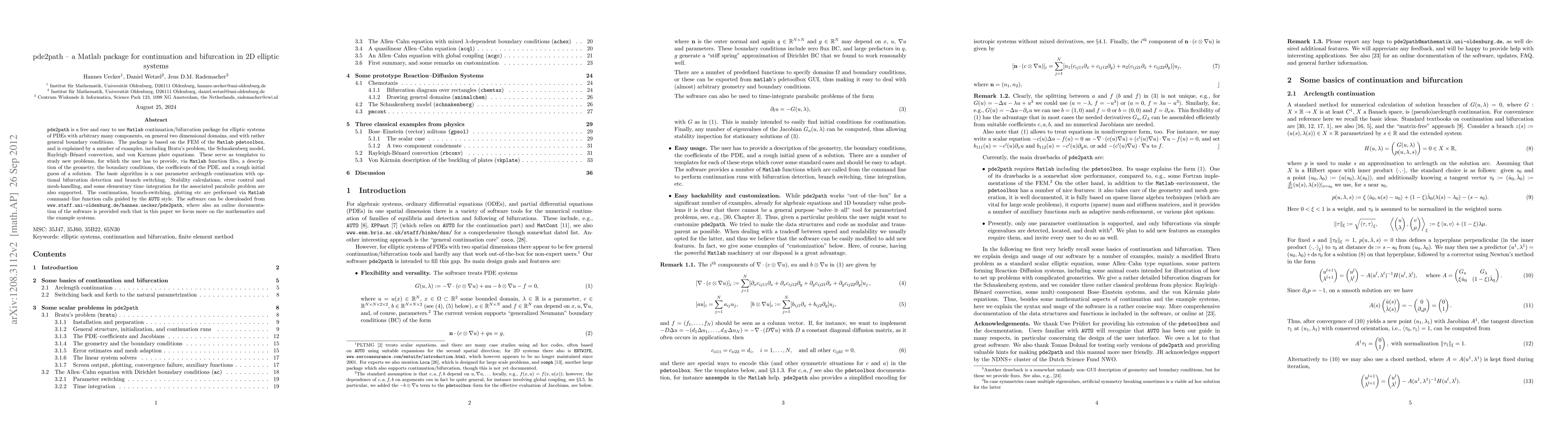 pde2path is a Matlab package for continuation and bifurcation analysis of elliptic PDE systems, utilizing the FEM of Matlab's pdetoolbox. It supports general 2D domains and boundary conditions, with examples like Bratu's problem, and includes arclength continuation and bifurcation detection.
