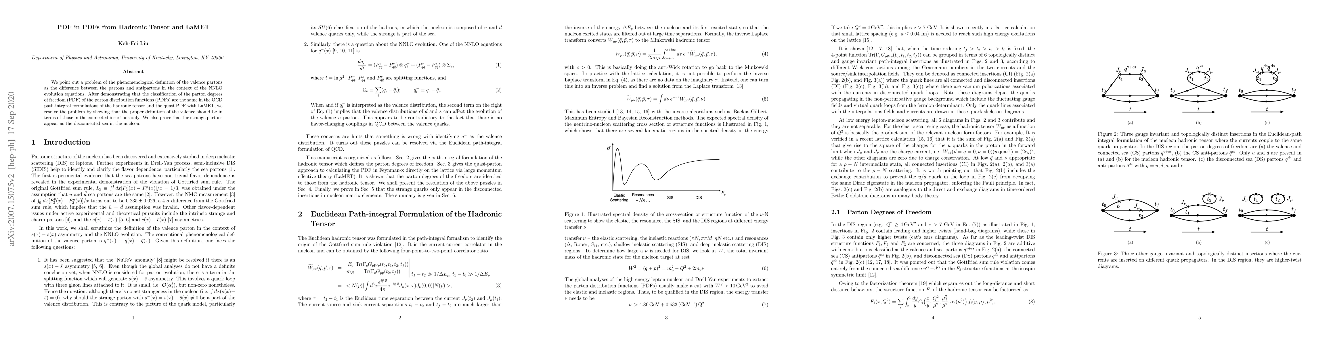 The paper identifies an issue with defining valence partons in NNLO evolution equations and resolves it by proposing a new definition based on connected insertions. It also proves that strange partons manifest as disconnected sea in nucleons, using both hadronic tensor and quasi-PDF with LaMET.