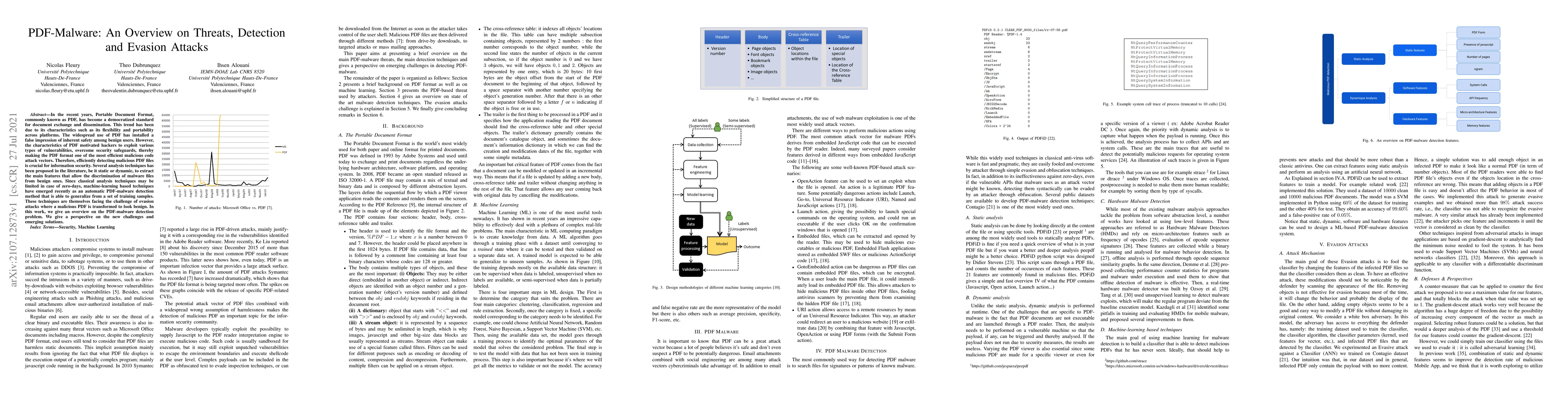 This paper provides an overview of threats posed by PDF-malware, detailing detection techniques and the challenges of evasion attacks. It highlights the rise of machine-learning methods for detection, while noting the ongoing threat of evasion tactics that aim to disguise malicious PDFs.
