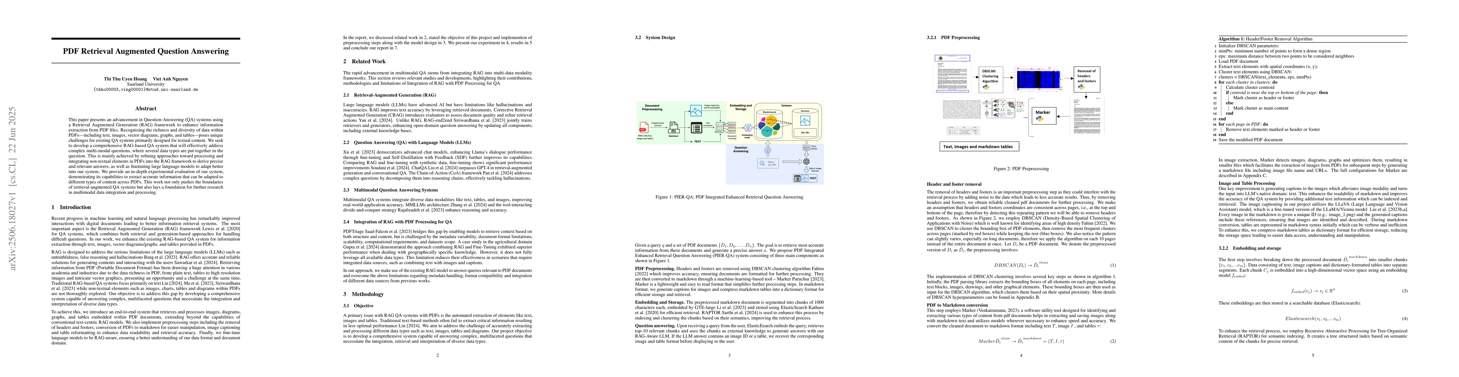 This paper presents an advancement in Question-Answering (QA) systems using a Retrieval Augmented Generation (RAG) framework to enhance information extraction from PDF files. Recognizing the richness and diversity of data within PDFs--including text, images, vector diagrams, graphs, and tables--poses unique challenges for existing QA systems primarily designed for textual content. We seek to develop a comprehensive RAG-based QA system that will effectively address complex multimodal questions, where several data types are combined in the query. This is mainly achieved by refining approaches to processing and integrating non-textual elements in PDFs into the RAG framework to derive precise and relevant answers, as well as fine-tuning large language models to better adapt to our system. We provide an in-depth experimental evaluation of our solution, demonstrating its capability to extract accurate information that can be applied to different types of content across PDFs. This work not only pushes the boundaries of retrieval-augmented QA systems but also lays a foundation for further research in multimodal data integration and processing.