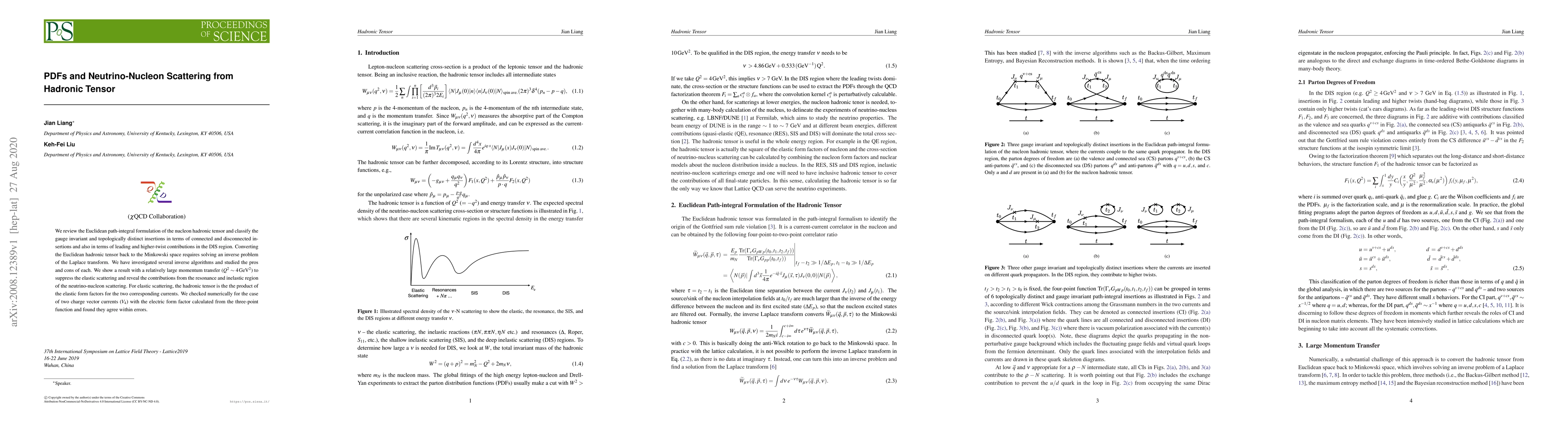 We review the Euclidean path-integral formulation of the nucleon hadronic tensor and classify the gauge invariant and topologically distinct insertions in terms of connected and disconnected insertions and also in terms of leading and higher-twist contributions in the DIS region. Converting the Euclidean hadronic tensor back to the Minkowski space requires solving an inverse problem of the Laplace transform. We have investigated several inverse algorithms and studied the pros and cons of each. We show a result with a relatively large momentum transfer ($Q^2 \sim 4\, {\rm GeV^2}$) to suppress the elastic scattering and reveal the contributions from the resonance and inelastic region of the neutrino-nucleon scattering. For elastic scattering, the hadronic tensor is the the product of the elastic form factors for the two corresponding currents. We checked numerically for the case of two charge vector currents ($V_4$) with the electric form factor calculated from the three-point function and found they agree within errors.