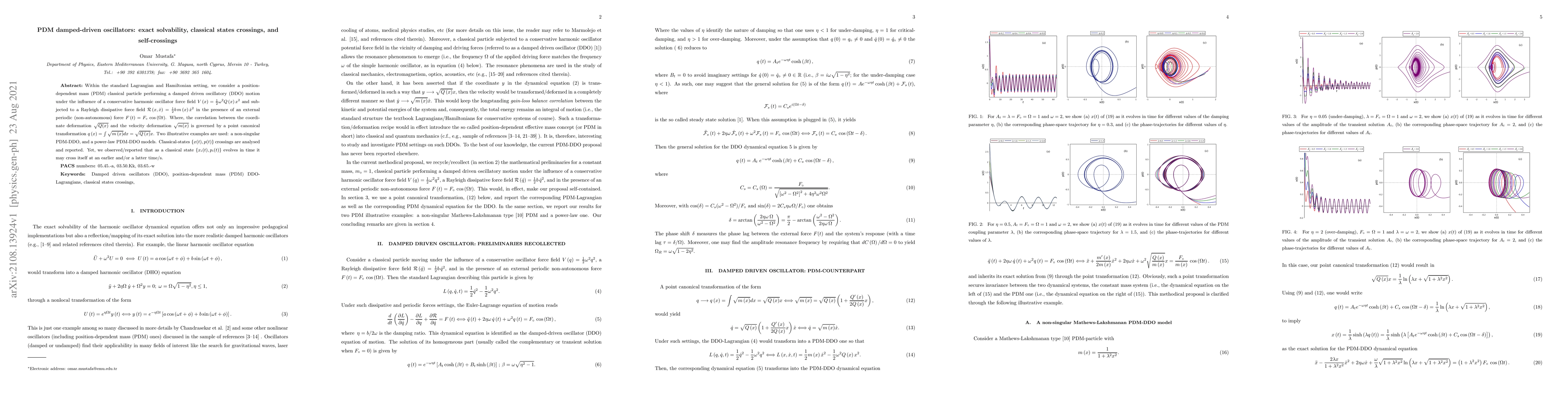 Within the standard Lagrangian and Hamiltonian setting, we consider a position-dependent mass (PDM) classical particle performing a damped driven oscillatory (DDO) motion under the influence of a conservative harmonic oscillator force field $V\left( x\right) =\frac{1}{2}\omega ^{2}Q\left( x\right) x^{2}$ and subjected to a Rayleigh dissipative force field $\mathcal{R}\left( x,\dot{x}\right) =\frac{1}{2}b\,m\left( x\right) \dot{x}^{2}$ in the presence of an external periodic (non-autonomous) force $F\left( t\right) =F_{\circ }\,\cos \left( \Omega t\right) $. Where, the correlation between the coordinate deformation $\sqrt{Q(x)}$ and the velocity deformation $\sqrt{m(x)}$ is governed by a point canonical transformation $q\left( x\right) =\int \sqrt{m\left( x\right) }dx=\sqrt{% Q\left( x\right) }x$. Two illustrative examples are used: a non-singular PDM-DDO, and a power-law PDM-DDO models. Classical-states $\{x(t),p(t)\}$ crossings are analysed and reported. Yet, we observed/reported that as a classical state $\{x_{i}(t),p_{i}(t)\}$ evolves in time it may cross itself at an earlier and/or a latter time/s.