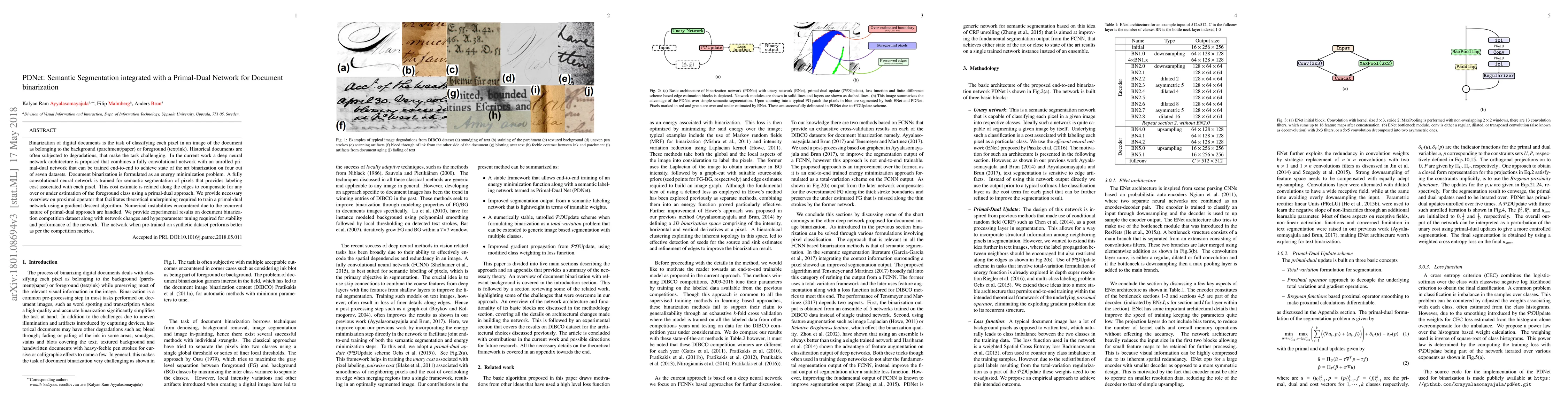PDNet integrates a fully convolutional network with a primal-dual network for document binarization, achieving state-of-the-art results on several datasets by refining pixel segmentation costs through an energy minimization approach. The method addresses numerical instabilities and performs optimally when pre-trained on synthetic data.
