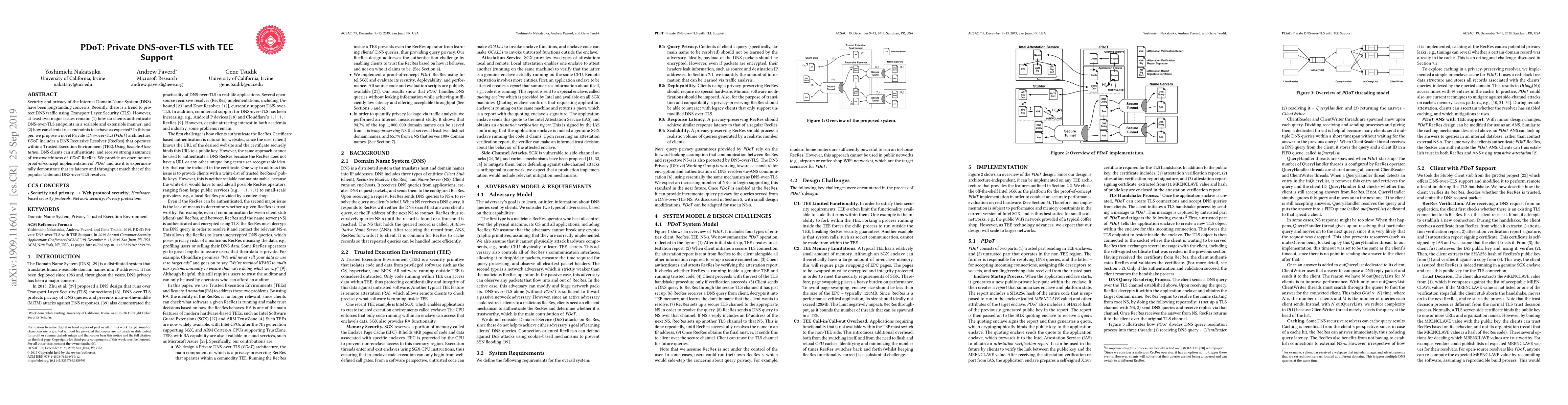 This paper proposes PDoT, a Private DNS-over-TLS architecture with a DNS Recursive Resolver operating within a Trusted Execution Environment (TEE) to enhance security and privacy. It uses Remote Attestation for client authentication and trustworthiness assurance, and demonstrates comparable latency and throughput to Unbound.