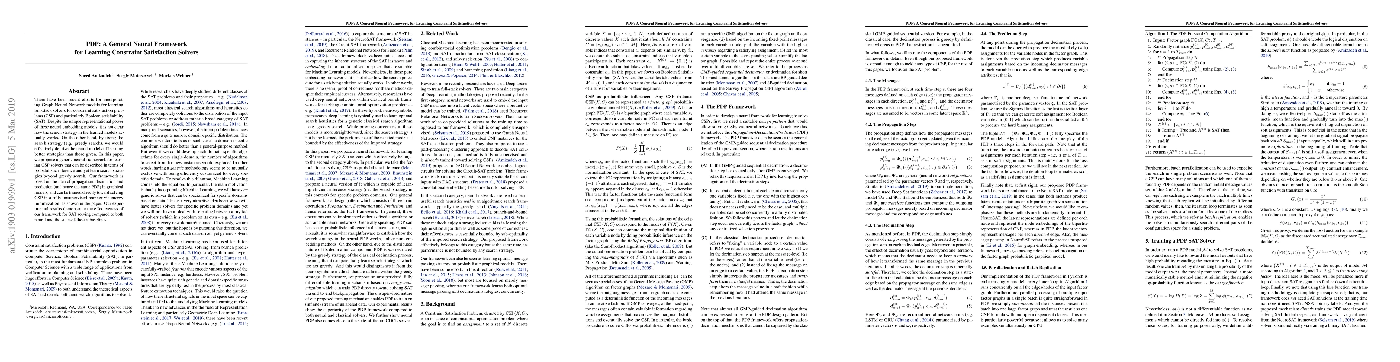 This paper proposes a neural framework named PDP for learning constraint satisfaction solvers, which leverages probabilistic inference and can learn search strategies beyond greedy methods. The PDP framework is trained via energy minimization and outperforms both neural and traditional baselines in solving SAT problems.