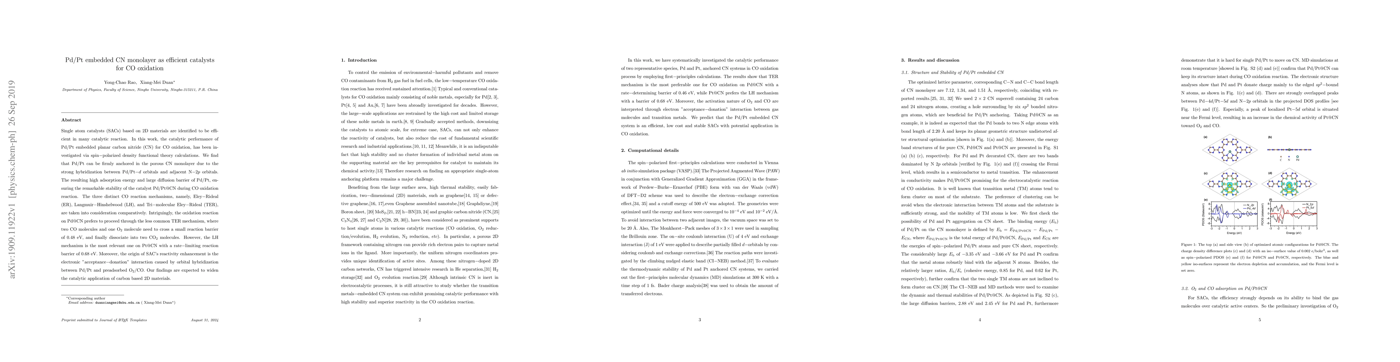 This paper investigates the catalytic efficiency of Pd/Pt embedded carbon nitride monolayers for CO oxidation using density functional theory. The study reveals that Pd/Pt atoms are strongly anchored in the CN monolayer due to orbital hybridization, leading to high adsorption energy and stability, with Pd@CN favoring a less common Tri-molecular Eley-Rideal mechanism and Pt@CN favoring the Langmuir-Hinshelwood mechanism.