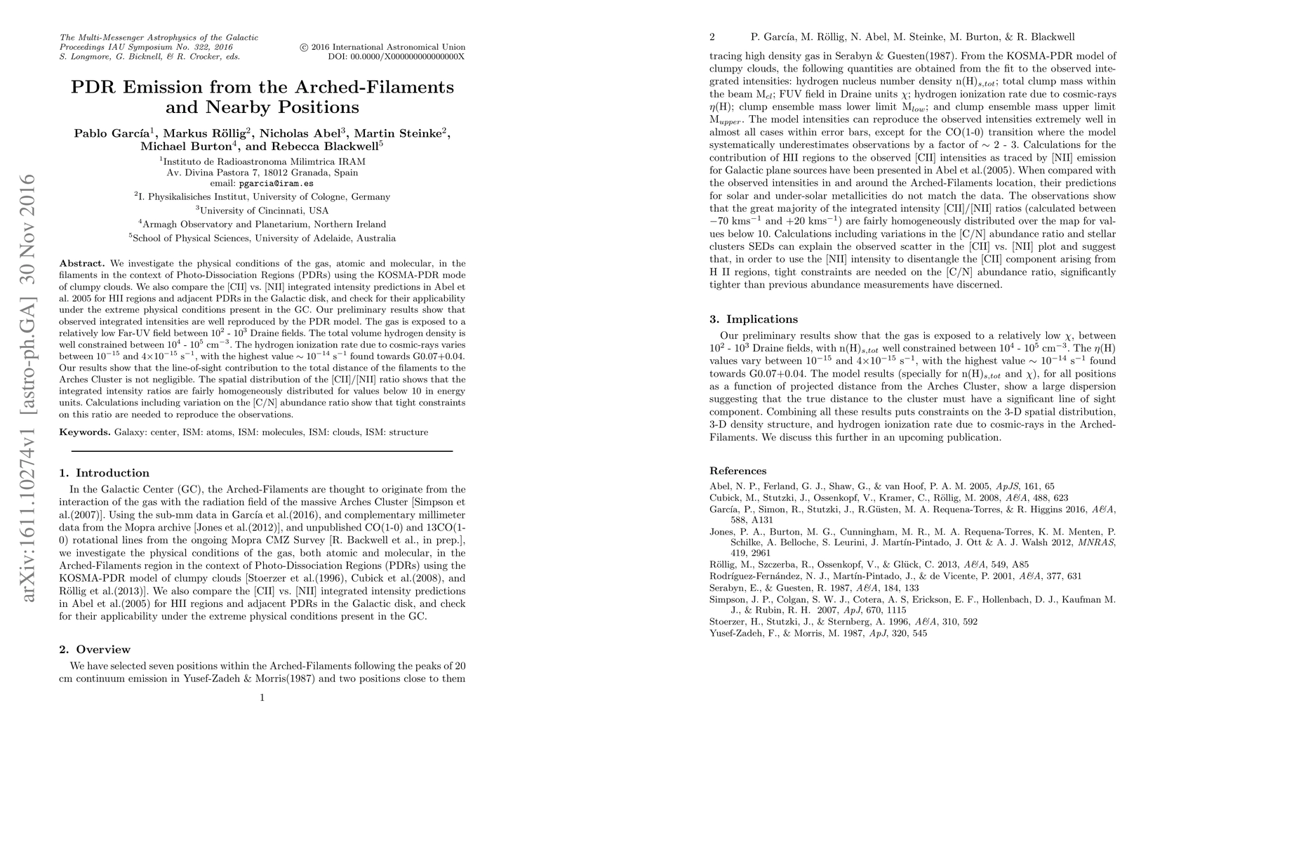 We investigate the physical conditions of the gas, atomic and molecular, in the filaments in the context of Photo-Dissociation Regions (PDRs) using the KOSMA-PDR mode of clumpy clouds. We also compare the [CII] vs. [NII] integrated intensity predictions in Abel et al. 2005 for HII regions and adjacent PDRs in the Galactic disk, and check for their applicability under the extreme physical conditions present in the GC. Our preliminary results show that observed integrated intensities are well reproduced by the PDR model. The gas is exposed to a relatively low Far-UV field between 10^2 - 10^3 Draine fields. The total volume hydrogen density is well constrained between 10^4 - 10^5 cm^-3. The hydrogen ionization rate due to cosmic-rays varies between 10^-15 and 4x10^-15 s^-1, with the highest value ~ 10^-14 s^-1 found towards G0.07+0.04. Our results show that the line-of-sight contribution to the total distance of the filaments to the Arches Cluster is not negligible. The spatial distribution of the [CII]/[NII] ratio shows that the integrated intensity ratios are fairly homogeneously distributed for values below 10 in energy units. Calculations including variation on the [C/N] abundance ratio show that tight constraints on this ratio are needed to reproduce the observations.