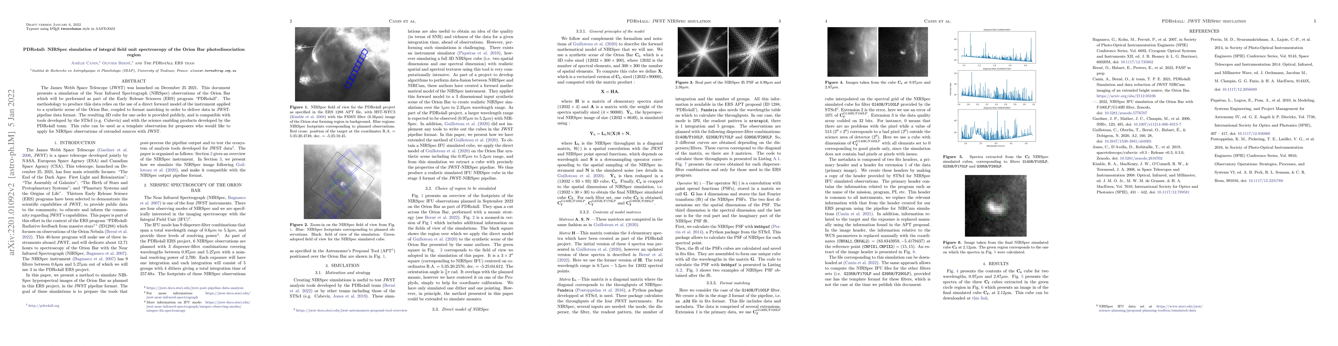 This paper simulates NIRSpec observations of the Orion Bar using the JWST, part of the "PDRs4all" ERS program. The simulation employs a direct forward model and a synthetic scene to produce a 3D data cube, which is publicly available and compatible with JWST-pipeline tools.