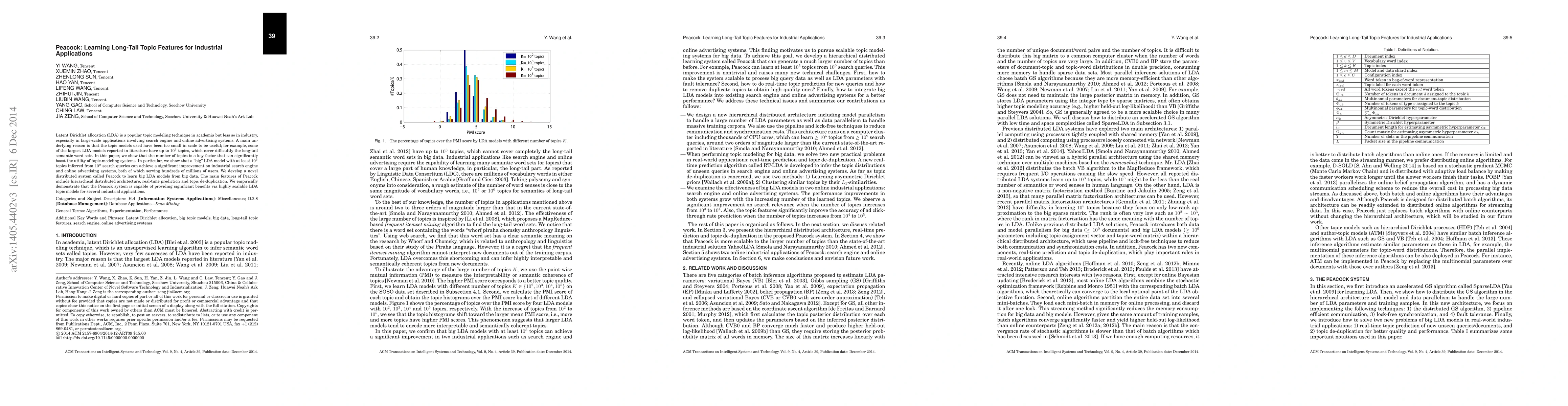Latent Dirichlet allocation (LDA) is a popular topic modeling technique in academia but less so in industry, especially in large-scale applications involving search engine and online advertising systems. A main underlying reason is that the topic models used have been too small in scale to be useful; for example, some of the largest LDA models reported in literature have up to $10^3$ topics, which cover difficultly the long-tail semantic word sets. In this paper, we show that the number of topics is a key factor that can significantly boost the utility of topic-modeling systems. In particular, we show that a "big" LDA model with at least $10^5$ topics inferred from $10^9$ search queries can achieve a significant improvement on industrial search engine and online advertising systems, both of which serving hundreds of millions of users. We develop a novel distributed system called Peacock to learn big LDA models from big data. The main features of Peacock include hierarchical distributed architecture, real-time prediction and topic de-duplication. We empirically demonstrate that the Peacock system is capable of providing significant benefits via highly scalable LDA topic models for several industrial applications.
