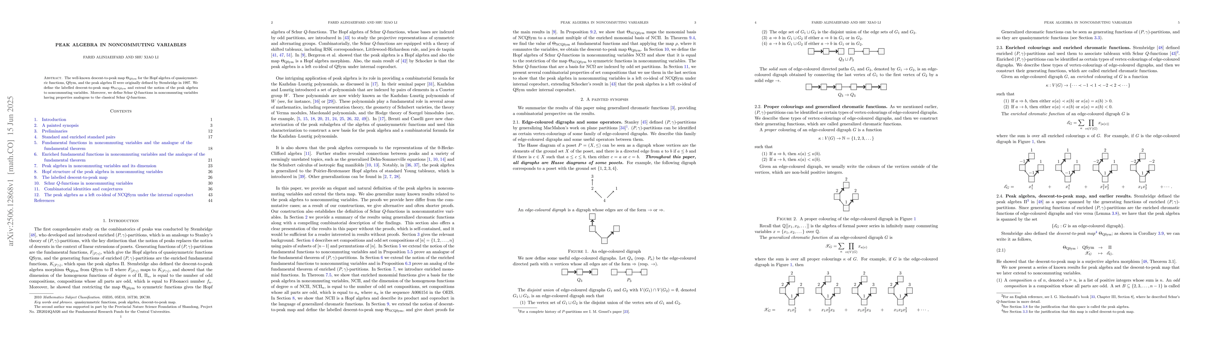 The well-known descent-to-peak map $\Theta_{\mathrm{QSym}}$ for the Hopf algebra of quasisymmetric functions, $\mathrm{QSym}$, and the peak algebra $\Pi$ were originally defined by Stembridge in 1997. We define the labelled descent-to-peak map $\Theta_{\mathrm{NCQSym}}$ and extend the notion of the peak algebra to noncommuting variables. Moreover, we define Schur $Q$-functions in noncommuting variables having properties analogous to the classical Schur $Q$-functions.