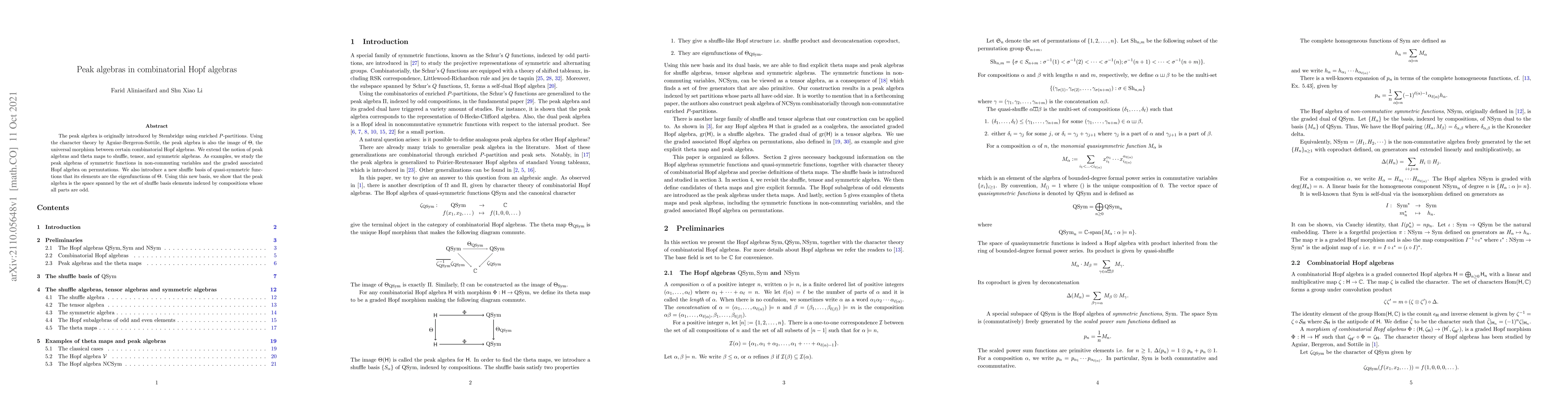 The peak algebra is originally introduced by Stembridge using enriched $P$-partitions. Using the character theory by Aguiar-Bergeron-Sottile, the peak algebra is also the image of $\Theta$, the universal morphism between certain combinatorial Hopf algebras. We extend the notion of peak algebras and theta maps to shuffle, tensor, and symmetric algebras. As examples, we study the peak algebras of symmetric functions in non-commuting variables and the graded associated Hopf algebra on permutations. We also introduce a new shuffle basis of quasi-symmetric functions that its elements are the eigenfunctions of $\Theta$. Using this new basis, we show that the peak algebra is the space spanned by the set of shuffle basis elements indexed by compositions whose all parts are odd.