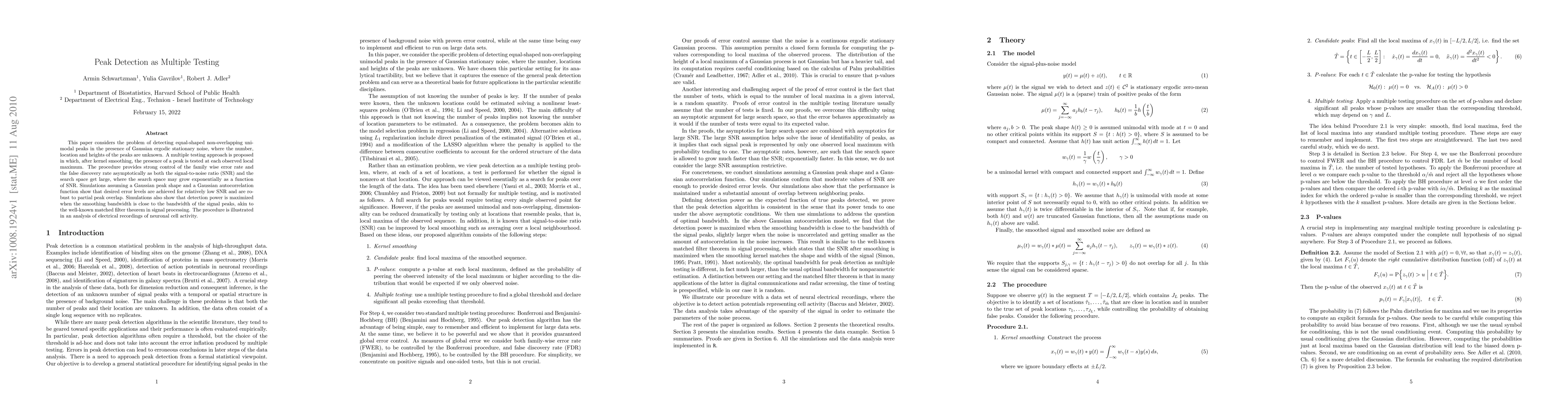 This paper considers the problem of detecting equal-shaped non-overlapping unimodal peaks in the presence of Gaussian ergodic stationary noise, where the number, location and heights of the peaks are unknown. A multiple testing approach is proposed in which, after kernel smoothing, the presence of a peak is tested at each observed local maximum. The procedure provides strong control of the family wise error rate and the false discovery rate asymptotically as both the signal-to-noise ratio (SNR) and the search space get large, where the search space may grow exponentially as a function of SNR. Simulations assuming a Gaussian peak shape and a Gaussian autocorrelation function show that desired error levels are achieved for relatively low SNR and are robust to partial peak overlap. Simulations also show that detection power is maximized when the smoothing bandwidth is close to the bandwidth of the signal peaks, akin to the well-known matched filter theorem in signal processing. The procedure is illustrated in an analysis of electrical recordings of neuronal cell activity.