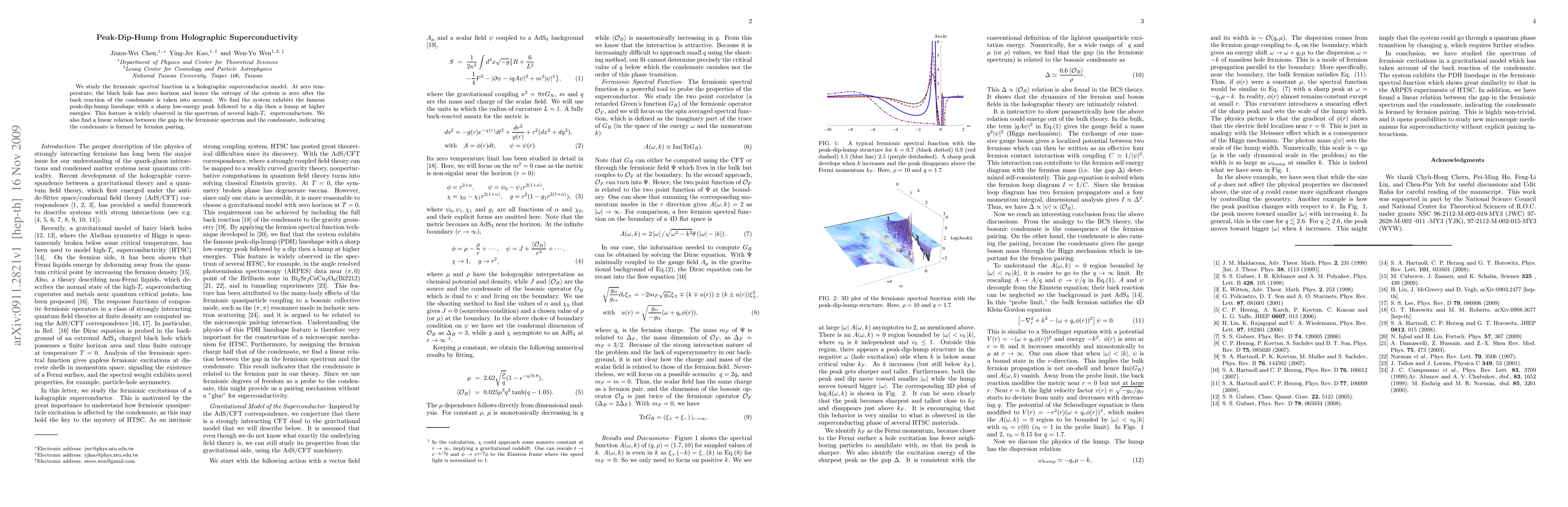 We study the fermionic spectral function in a holographic superconductor model. At zero temperature, the black hole has zero horizon and hence the entropy of the system is zero after the back reaction of the condensate is taken into account. We find the system exhibits the famous peak-dip-hump lineshape with a sharp low-energy peak followed by a dip then a hump at higher energies. This feature is widely observed in the spectrum of several high-T_c superconductors. We also find a linear relation between the gap in the fermionic spectrum and the condensate, indicating the condensate is formed by fermion pairing.