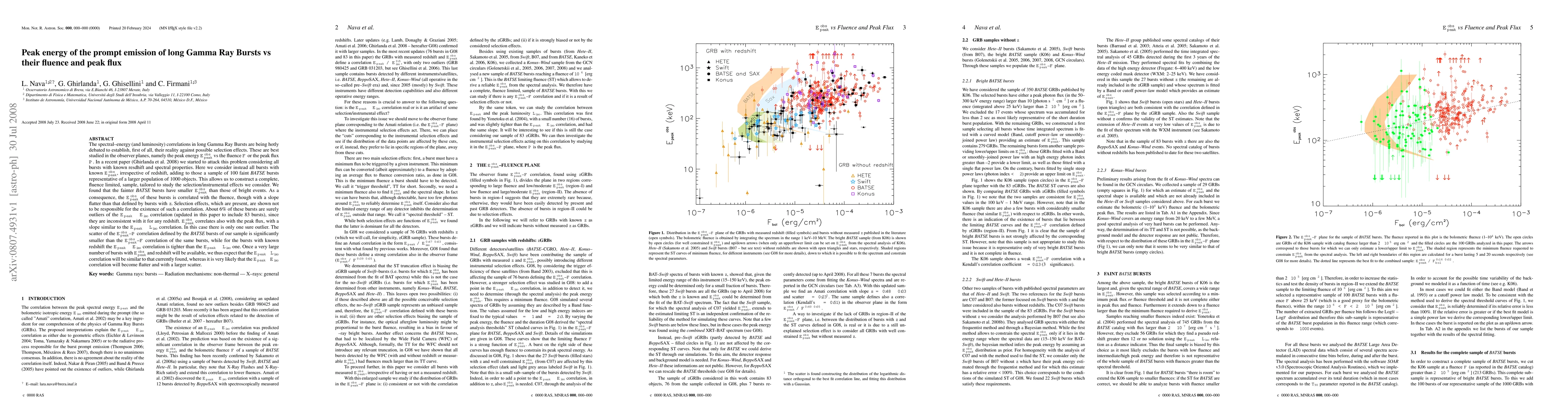The spectral-energy and (luminosity) correlations in long GRBs are being hotly debated to establish, first of all, their reality against possible selection effects. These are best studied in the observer planes, namely the peak energy E_peak_obs vs the fluence F or the peak flux P. In a recent paper we started to attack this problem considering all GRBs with known z and spectral properties. Here we consider instead all bursts with known E_peak_obs, irrespective of z, adding to those a sample of 100 faint BATSE bursts representative of a larger population. This allows us to construct a complete, fluence limited, sample, to study the selection/instrumental effects. We found that fainter bursts have smaller E_peak_obs than those of bright events. As a consequence, the E_peak_obs of these bursts is correlated with the fluence, though with a slope flatter than that defined by bursts with z. Selection effects, which are present, are shown not to be responsible for the existence of such a correlation. About 6% of these bursts are surely outliers of the E_peak-E_iso correlation (updated to include 83 bursts), since they are inconsistent with it for any z. E_peak_obs correlates also with P, with a slope similar to the E_peak-L_iso correlation.In this case there is only one sure outlier.The scatter of the E_peak_obs-P correlation defined by the BATSE bursts of our sample is smaller than the E_peak_obs-F correlation of the same bursts, while for the bursts with known z the E_peak-E_iso correlation is tighter than the E_peak-L_iso one. Once a very large number of bursts with E_peak_obs and z will be available, we thus expect that the E_peak-L_iso correlation will be similar to that currently found, whereas it is likely that the E_peak-E_iso correlation will become flatter and with a larger scatter.