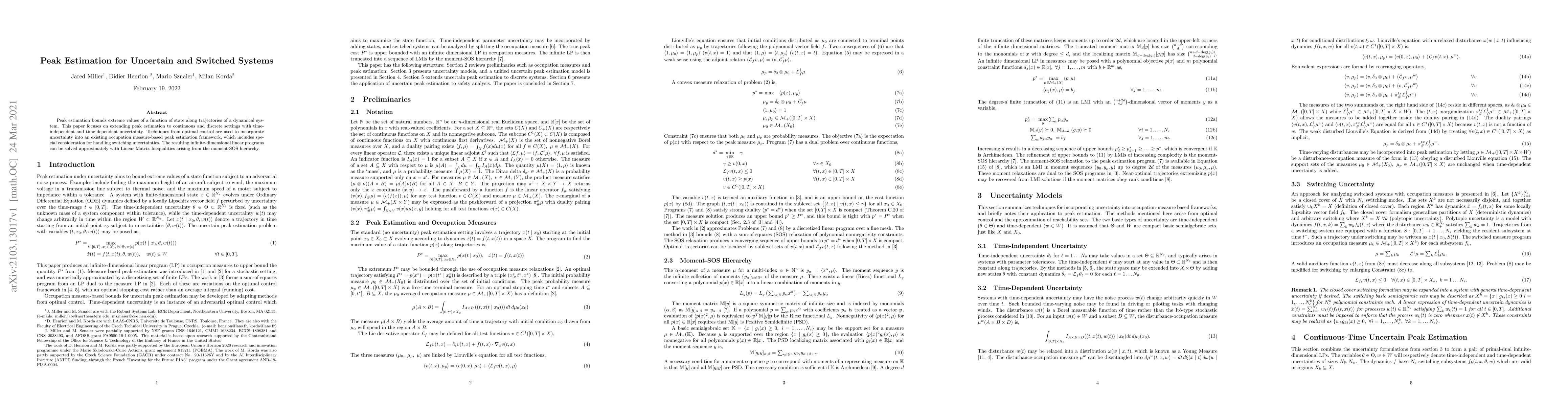 Peak estimation bounds extreme values of a function of state along trajectories of a dynamical system. This paper focuses on extending peak estimation to continuous and discrete settings with time-independent and time-dependent uncertainty. Techniques from optimal control are used to incorporate uncertainty into an existing occupation measure-based peak estimation framework, which includes special consideration for handling switching uncertainties. The resulting infinite-dimensional linear programs can be solved approximately with Linear Matrix Inequalities arising from the moment-SOS hierarchy.