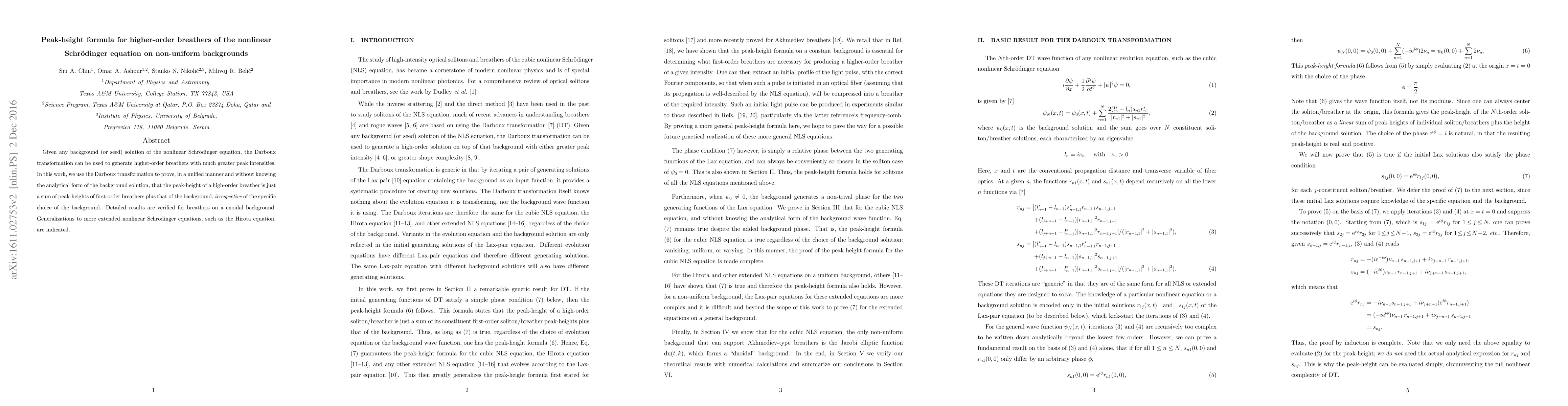 Researchers developed a formula to predict the peak height of higher-order breathers in the nonlinear Schr"odinger equation on non-uniform backgrounds, showing that it's a sum of peak heights of first-order breathers plus the background solution.