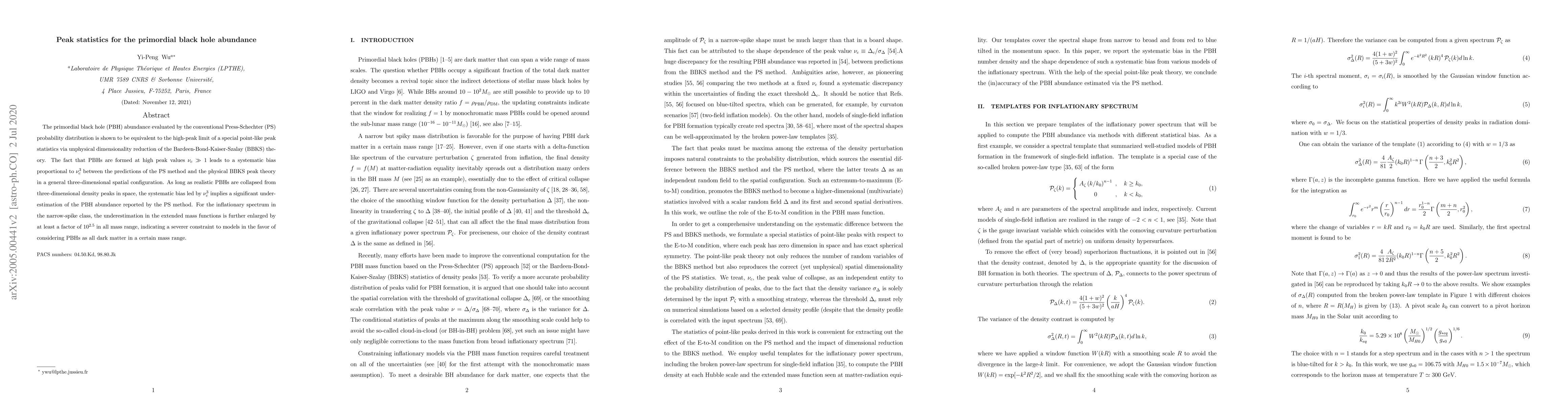 The primordial black hole (PBH) abundance evaluated by the conventional Press-Schechter (PS) probability distribution is shown to be equivalent to the high-peak limit of a special point-like peak statistics via unphysical dimensionality reduction of the Bardeen-Bond-Kaiser-Szalay (BBKS) theory. The fact that PBHs are formed at high peak values $\nu_c \gg 1$ leads to a systematic bias proportional to $\nu_c^3$ between the predictions of the PS method and the physical BBKS peak theory in a general three-dimensional spatial configuration. As long as realistic PBHs are collapsed from three-dimensional density peaks in space, the systematic bias led by $\nu_c^3$ implies a significant underestimation of the PBH abundance reported by the PS method. For the inflationary spectrum in the narrow-spike class, the underestimation in the extended mass functions is further enlarged by at least a factor of $10^{2.5}$ in all mass range, indicating a severer constraint to models in the favor of considering PBHs as all dark matter in a certain mass range.