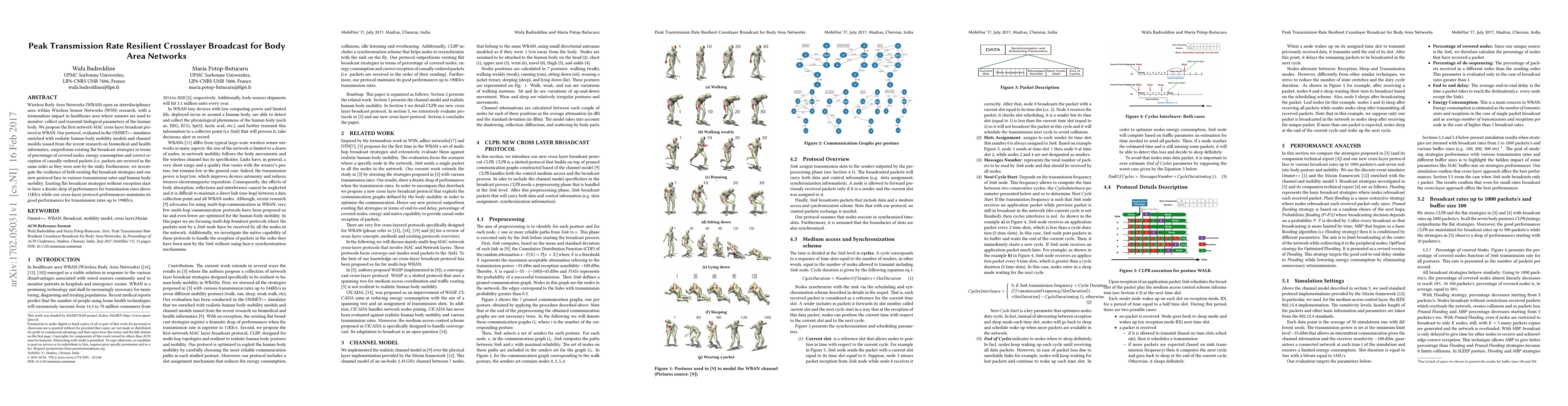 This paper proposes a novel cross-layer broadcast protocol for Wireless Body Area Networks (WBAN) that significantly improves coverage, energy efficiency, and packet reception order compared to existing strategies. The protocol maintains high performance at transmission rates up to 190Kb/s, while existing methods degrade above 11Kb/s.