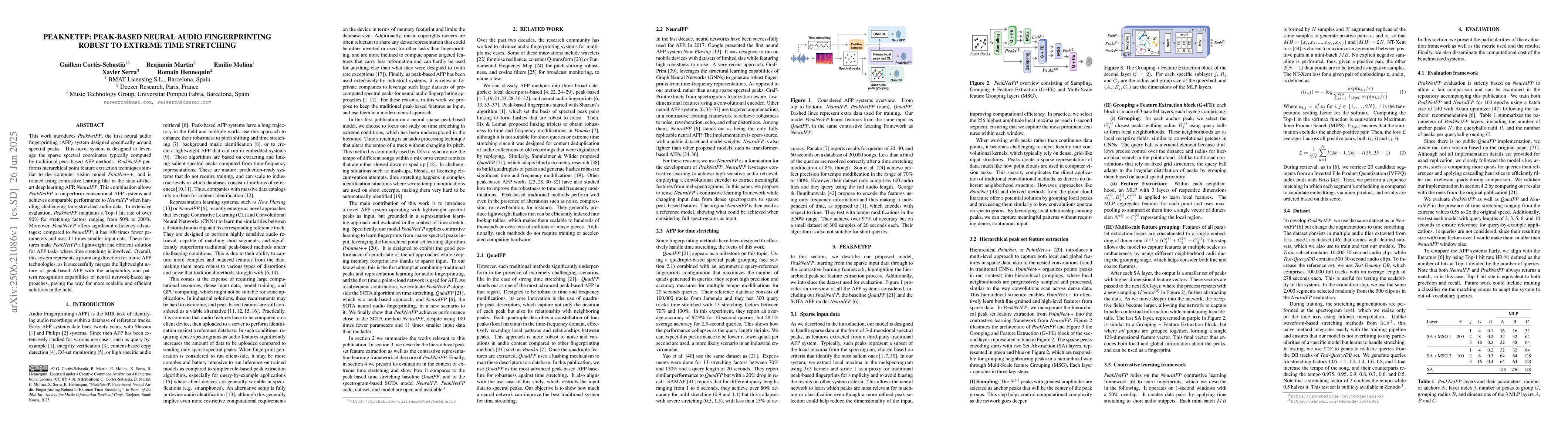 This is the first system to leverage spectral peaks with a PointNet++ inspired architecture for neural audio fingerprinting, combining the efficiency of peak-based methods with neural pattern recognition capabilities.