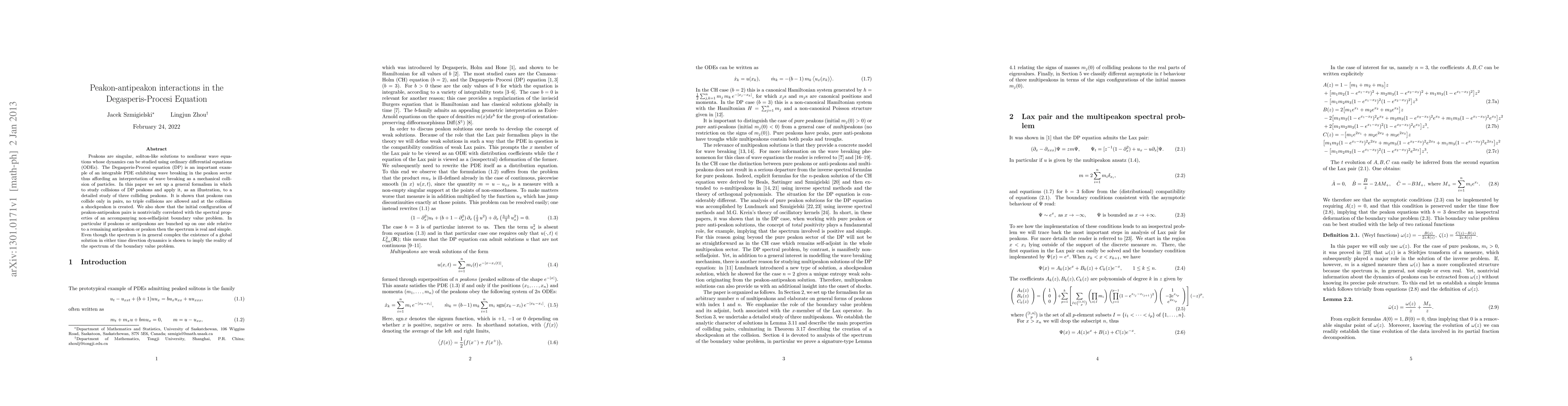 This paper develops a formalism to study interactions between peakons in the Degasperis-Procesi equation, revealing that peakons can only collide in pairs, creating a shockpeakon, and that the configuration of peakon-antipeakon pairs correlates with the spectral properties of a non-selfadjoint boundary value problem, ensuring real and simple spectra when peakons are bunched.