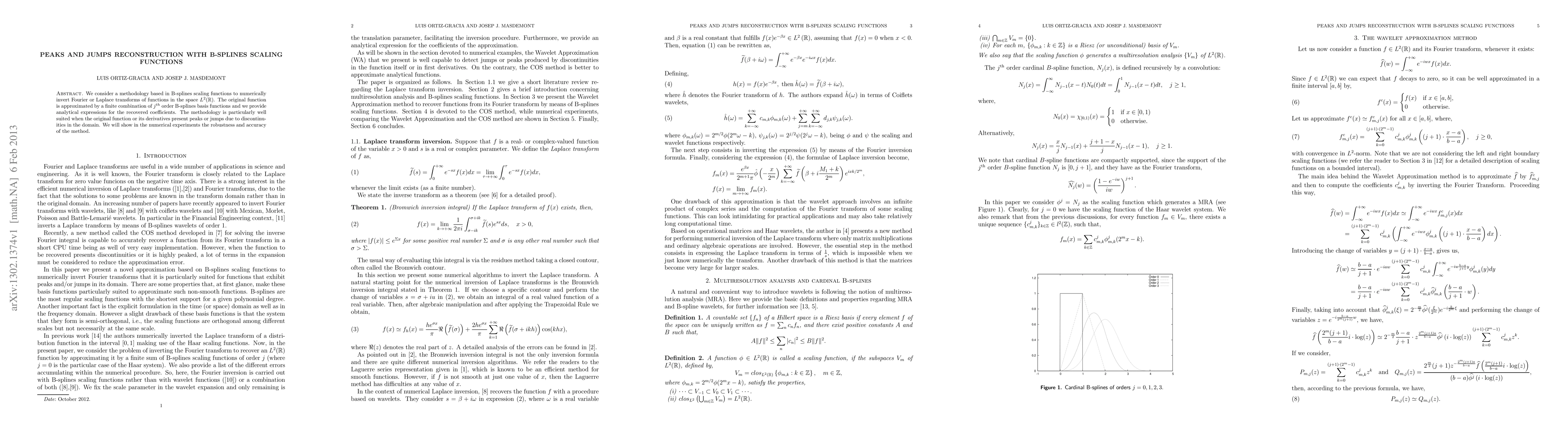 This paper proposes a B-splines scaling function methodology for numerically inverting Fourier or Laplace transforms of $L^2(\mathbb{R})$ functions, especially effective for functions with peaks or jumps. The method accurately reconstructs the original function by approximating it with a combination of B-spline basis functions and provides analytical expressions for the recovered coefficients.
