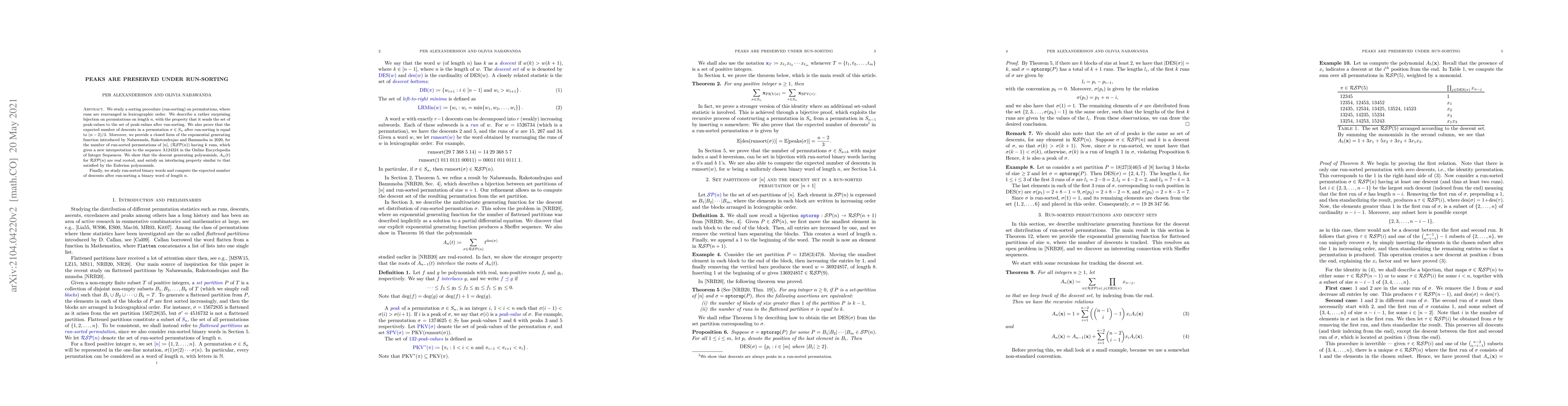 This paper investigates a sorting procedure called run-sorting on permutations, demonstrating a surprising bijection that preserves peak values. It also finds the expected number of descents after run-sorting and provides a closed form for the generating function of run-sorted permutations, revealing real-rooted descent generating polynomials with an interlacing property akin to Eulerian polynomials.