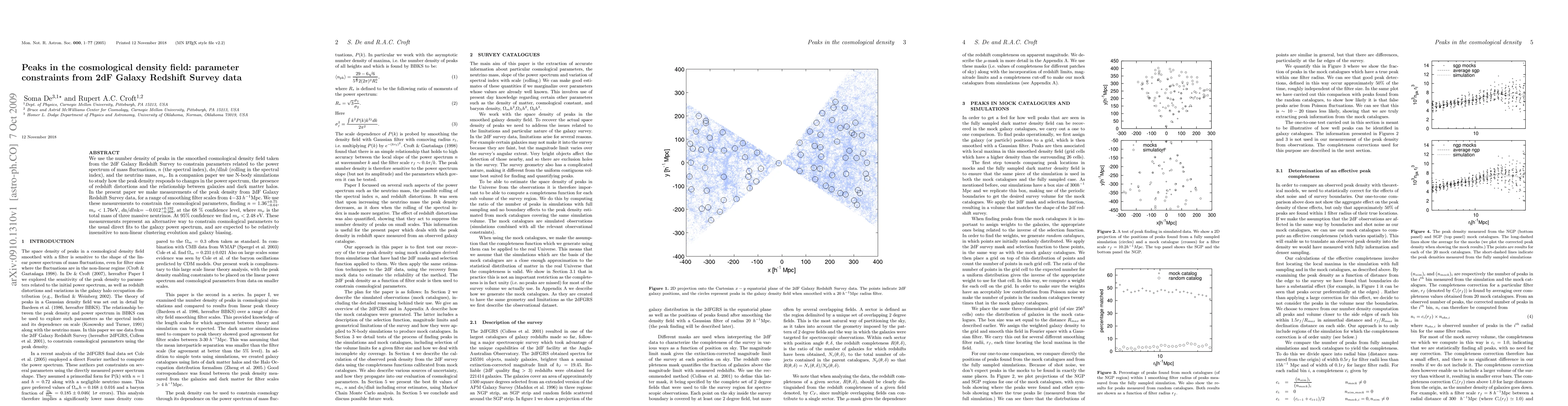 This paper uses the number density of peaks in the smoothed cosmological density field from the 2dF Galaxy Redshift Survey to constrain parameters like the spectral index n, rolling in the spectral index dn/d(lnk), and the neutrino mass m_nu. The study finds n=1.36 (+0.75)(-0.64), m_nu < 1.76 eV, and dn/d(lnk)=-0.012 (+0.192)(-0.208) at the 68% confidence level, providing an alternative method for cosmological parameter estimation.