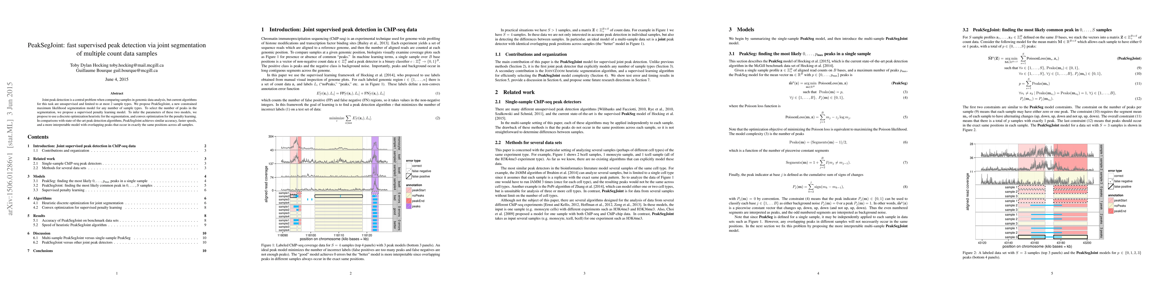Joint peak detection is a central problem when comparing samples in genomic data analysis, but current algorithms for this task are unsupervised and limited to at most 2 sample types. We propose PeakSegJoint, a new constrained maximum likelihood segmentation model for any number of sample types. To select the number of peaks in the segmentation, we propose a supervised penalty learning model. To infer the parameters of these two models, we propose to use a discrete optimization heuristic for the segmentation, and convex optimization for the penalty learning. In comparisons with state-of-the-art peak detection algorithms, PeakSegJoint achieves similar accuracy, faster speeds, and a more interpretable model with overlapping peaks that occur in exactly the same positions across all samples.