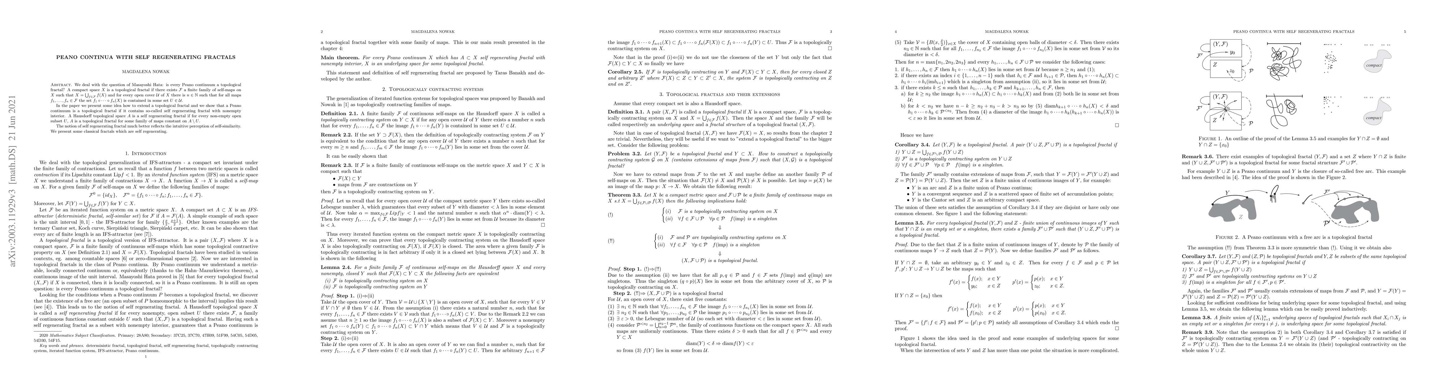 We deal with the question of Masayoshi Hata: is every Peano continuum a topological fractal? A compact space $X$ is a topological fractal if there exists $\mathcal{F}$ a finite family of self-maps on $X$ such that $X=\bigcup_{f\in\mathcal{F}}f(X)$ and for every open cover $\mathcal{U}$ of $X$ there is $n\in\mathbb{N}$ such that for all maps $f_1,\dots,f_n\in\mathcal{F}$ the set $f_1\circ\dots\circ f_n(X)$ is contained in some set $U\in\mathcal{U}$. In the paper we present some idea how to extend a topological fractal and we show that a Peano continuum is a topological fractal if it contains so-called self regenerating fractal with nonempty interior. A Hausdorff topological space $A$ is a self regenerating fractal if for every non-empty open subset $U$, $A$ is a topological fractal for some family of maps constant on $A\setminus U$. The notion of self regenerating fractal much better reflects the intuitive perception of self-similarity. We present some classical fractals which are self regenerating.