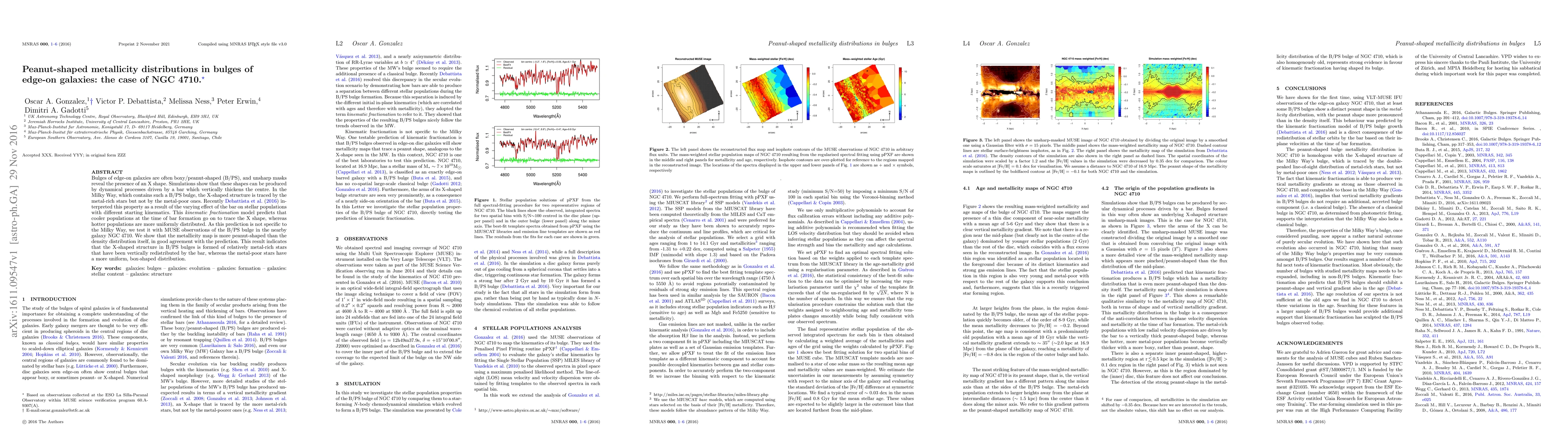 The study investigates the metallicity distribution in the peanut-shaped bulge of NGC 4710, finding that metal-rich stars trace the X-shaped structure, consistent with predictions from the kinematic fractionation model. This suggests that the X-shape in bulges is formed by metal-rich stars redistributed by a bar, while metal-poor stars maintain a more uniform distribution.