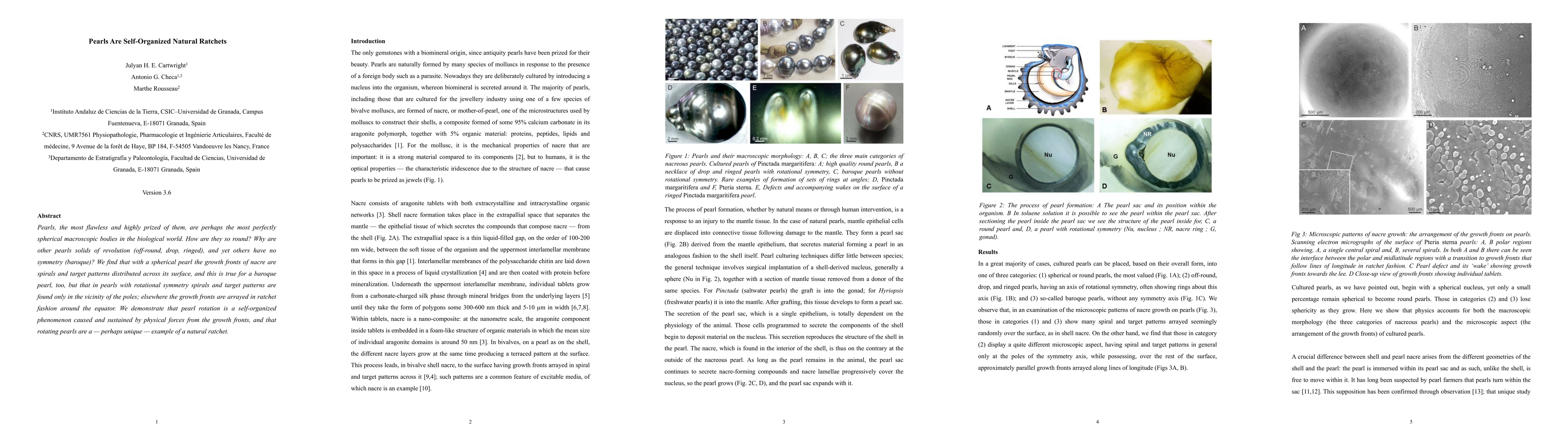 This research explores the self-organization mechanisms behind the spherical formation of pearls, identifying spiral and target patterns in nacre growth fronts. It concludes that pearls with rotational symmetry exhibit a unique ratchet-like pattern around their equator, which self-organizes through physical forces, making them a natural example of a ratchet mechanism.