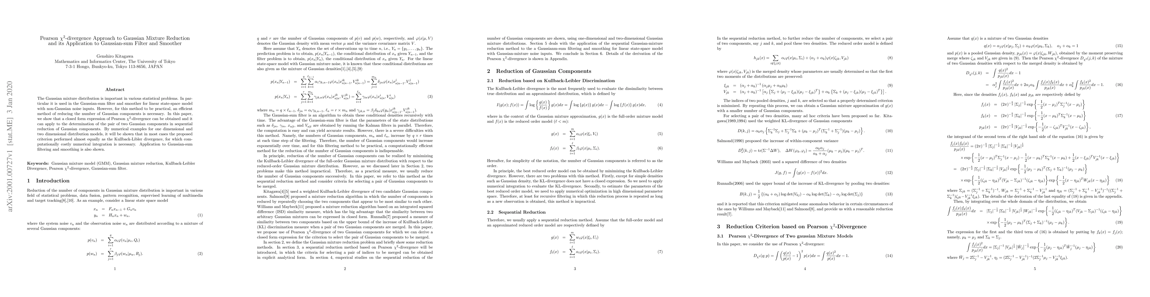 Researchers developed a new method to reduce Gaussian mixture distributions, using Pearson chi^2-divergence, which is faster and more efficient than the traditional Kullback-Libler divergence method, with promising results in applications to Gaussian-sum filter and smoother.