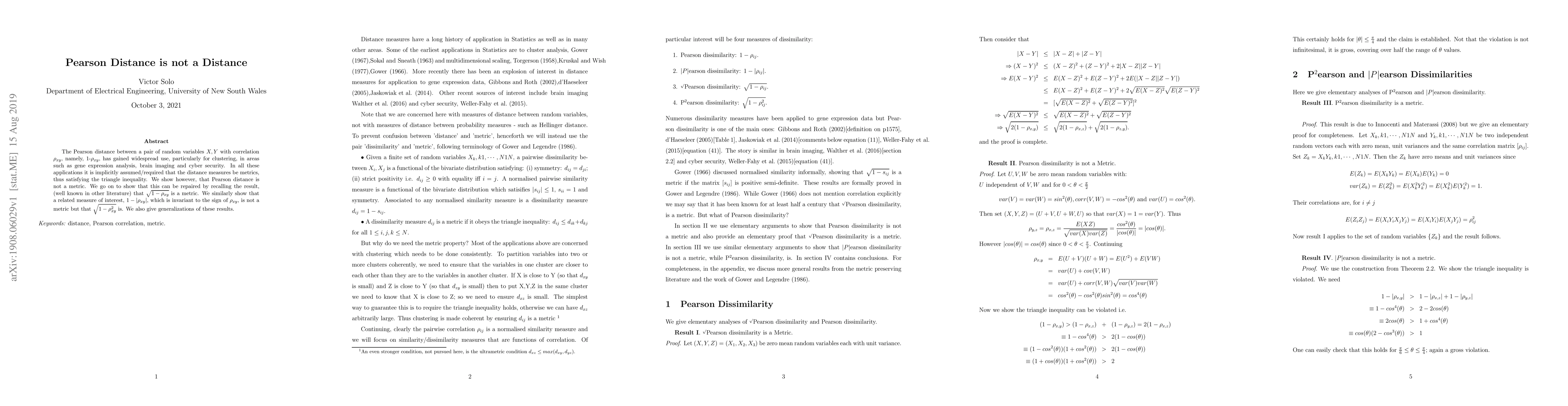 The Pearson distance between a pair of random variables $X,Y$ with correlation $\rho_{xy}$, namely, 1-$\rho_{xy}$, has gained widespread use, particularly for clustering, in areas such as gene expression analysis, brain imaging and cyber security. In all these applications it is implicitly assumed/required that the distance measures be metrics, thus satisfying the triangle inequality. We show however, that Pearson distance is not a metric. We go on to show that this can be repaired by recalling the result, (well known in other literature) that $\sqrt{1-\rho_{xy}}$ is a metric. We similarly show that a related measure of interest, $1-|\rho_{xy}|$, which is invariant to the sign of $\rho_{xy}$, is not a metric but that $\sqrt{1-\rho_{xy}^2}$ is. We also give generalizations of these results.