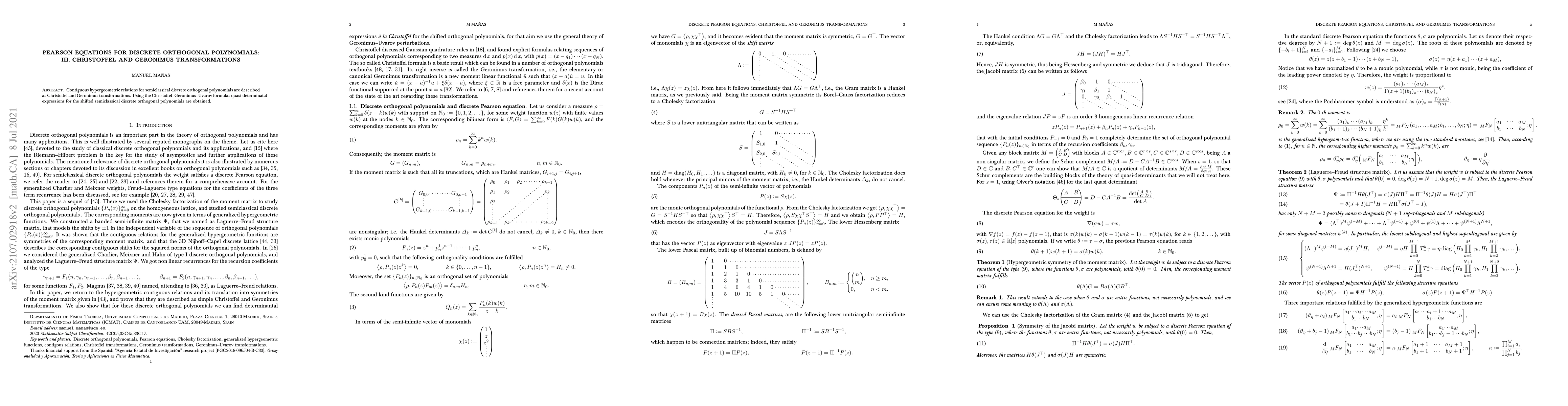 Contiguous hypergeometric relations for semiclassical discrete orthogonal polynomials are described as Christoffel and Geronimus transformations. Using the Christoffel-Geronimus-Uvarov formulas quasi-determinatal expressions for the shifted semiclassical discrete orthogonal polynomials are obtained.