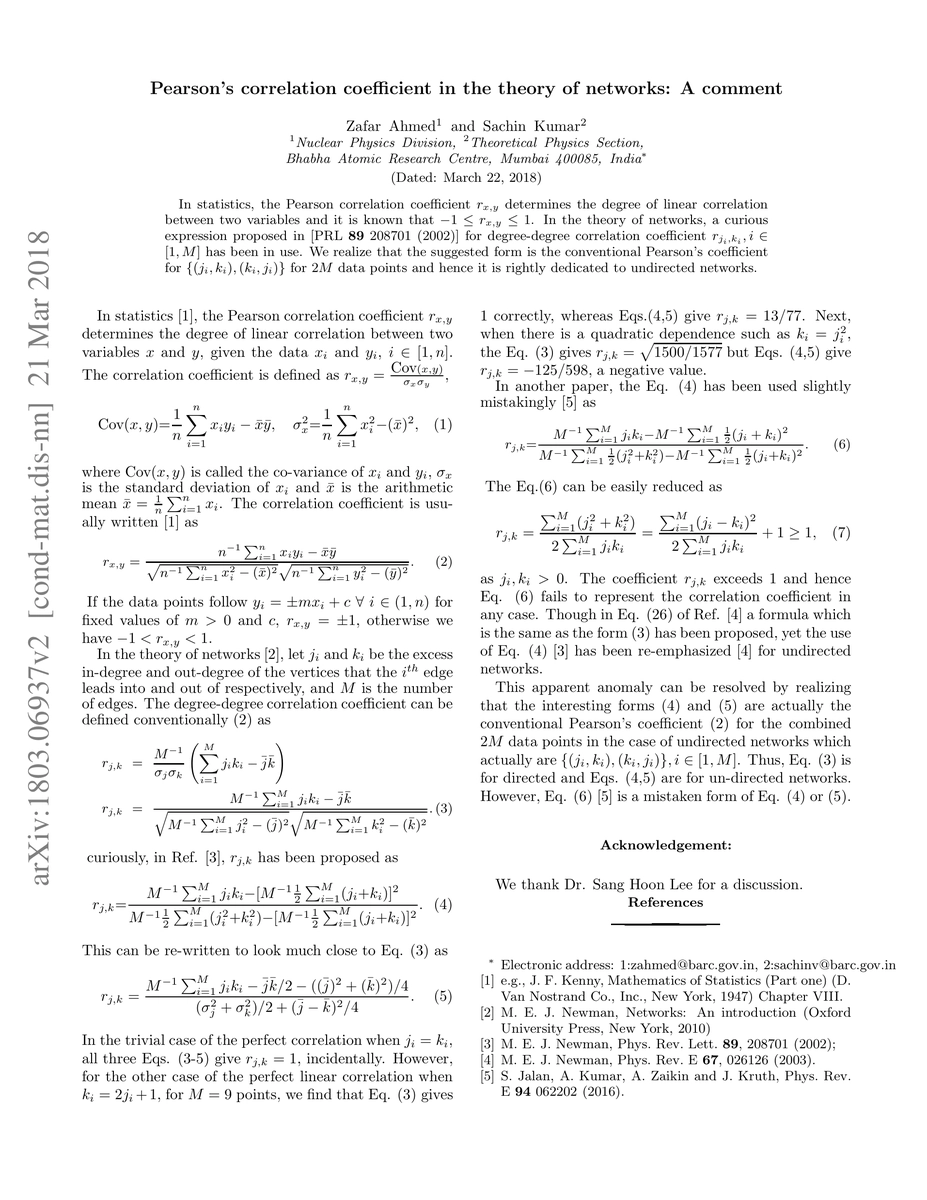 In statistics, the Pearson correlation coefficient $r_{x,y}$ determines the degree of linear correlation between two variables and it is known that $-1 \le r_{x,y} \le 1$. In the theory of networks, a curious expression proposed in [PRL {\bf 89} 208701 (2002)] for degree-degree correlation coefficient $r_{j_i,k_i}, i\in [1,M]$ has been in use. We realize that the suggested form is the conventional Pearson's coefficient for $\{(j_i,k_i), (k_i,j_i)\}$ for $2M$ data points and hence it is rightly dedicated to undirected networks.