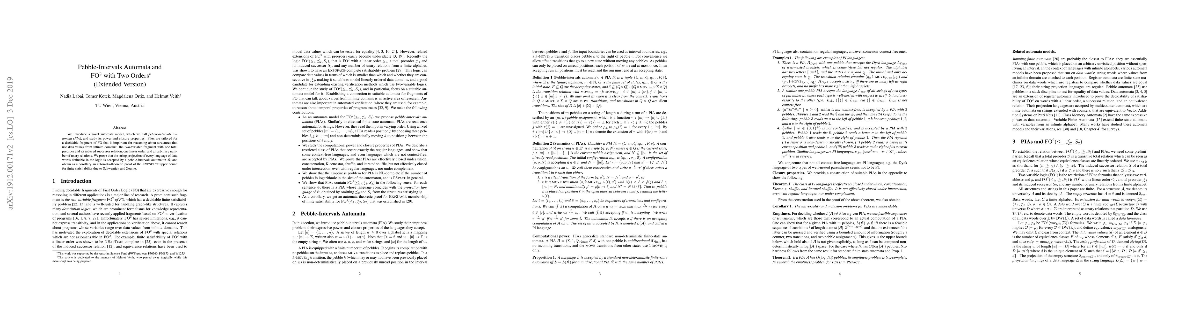 Researchers introduce a new automata model called Pebble-Intervals Automata (PIA) to study a decidable fragment of first-order logic involving data values from infinite domains. They prove that every language definable in this logic can be accepted by a PIA, providing an automata-theoretic proof for the EXPSPACE upper bound on finite satisfiability.