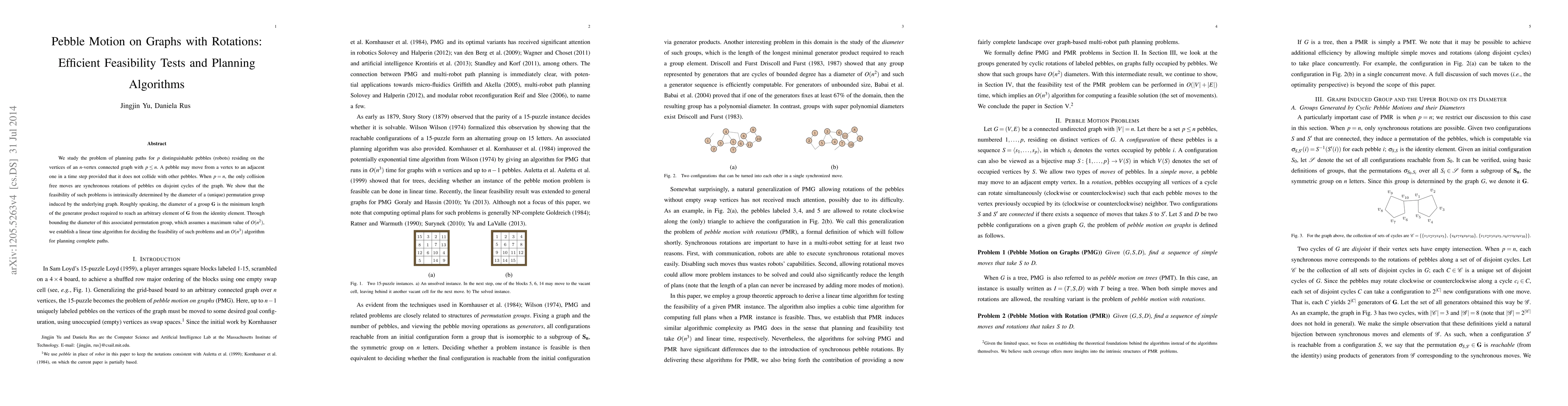 We study the problem of planning paths for $p$ distinguishable pebbles (robots) residing on the vertices of an $n$-vertex connected graph with $p \le n$. A pebble may move from a vertex to an adjacent one in a time step provided that it does not collide with other pebbles. When $p = n$, the only collision free moves are synchronous rotations of pebbles on disjoint cycles of the graph. We show that the feasibility of such problems is intrinsically determined by the diameter of a (unique) permutation group induced by the underlying graph. Roughly speaking, the diameter of a group $\mathbf G$ is the minimum length of the generator product required to reach an arbitrary element of $\mathbf G$ from the identity element. Through bounding the diameter of this associated permutation group, which assumes a maximum value of $O(n^2)$, we establish a linear time algorithm for deciding the feasibility of such problems and an $O(n^3)$ algorithm for planning complete paths.