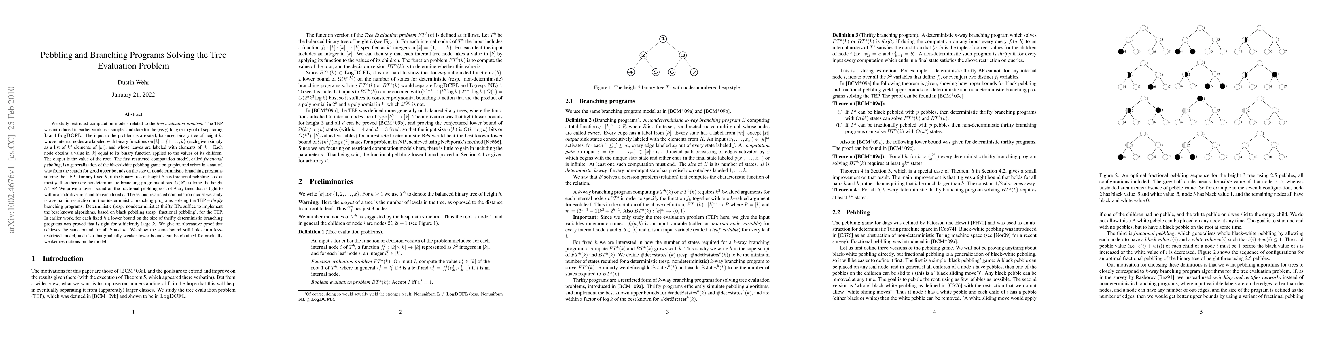 We study restricted computation models related to the Tree Evaluation Problem}. The TEP was introduced in earlier work as a simple candidate for the (*very*) long term goal of separating L and LogDCFL. The input to the problem is a rooted, balanced binary tree of height h, whose internal nodes are labeled with binary functions on [k] = {1,...,k} (each given simply as a list of k^2 elements of [k]), and whose leaves are labeled with elements of [k]. Each node obtains a value in [k] equal to its binary function applied to the values of its children, and the output is the value of the root. The first restricted computation model, called Fractional Pebbling, is a generalization of the black/white pebbling game on graphs, and arises in a natural way from the search for good upper bounds on the size of nondeterministic branching programs (BPs) solving the TEP - for any fixed h, if the binary tree of height h has fractional pebbling cost at most p, then there are nondeterministic BPs of size O(k^p) solving the height h TEP. We prove a lower bound on the fractional pebbling cost of d-ary trees that is tight to within an additive constant for each fixed d. The second restricted computation model we study is a semantic restriction on (non)deterministic BPs solving the TEP - Thrifty BPs. Deterministic (resp. nondeterministic) thrifty BPs suffice to implement the best known algorithms for the TEP, based on black (resp. fractional) pebbling. In earlier work, for each fixed h a lower bound on the size of deterministic thrifty BPs was proved that is tight for sufficiently large k. We give an alternative proof that achieves the same bound for all k. We show the same bound still holds in a less-restricted model, and also that gradually weaker lower bounds can be obtained for gradually weaker restrictions on the model.