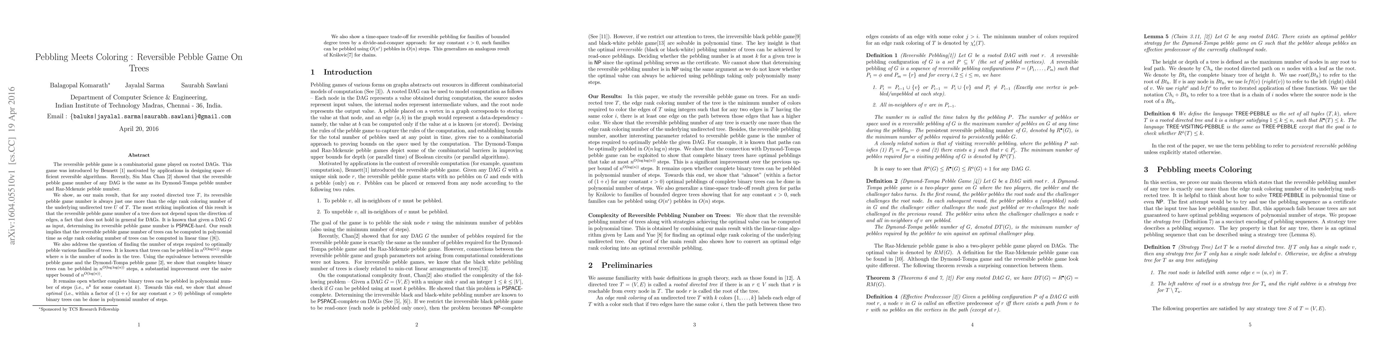 This paper explores the reversible pebble game on directed trees, demonstrating that its number is one more than the edge rank coloring number of the underlying undirected tree. It also shows polynomial-time computation for this number in trees and improves the optimal pebbling steps for complete binary trees.